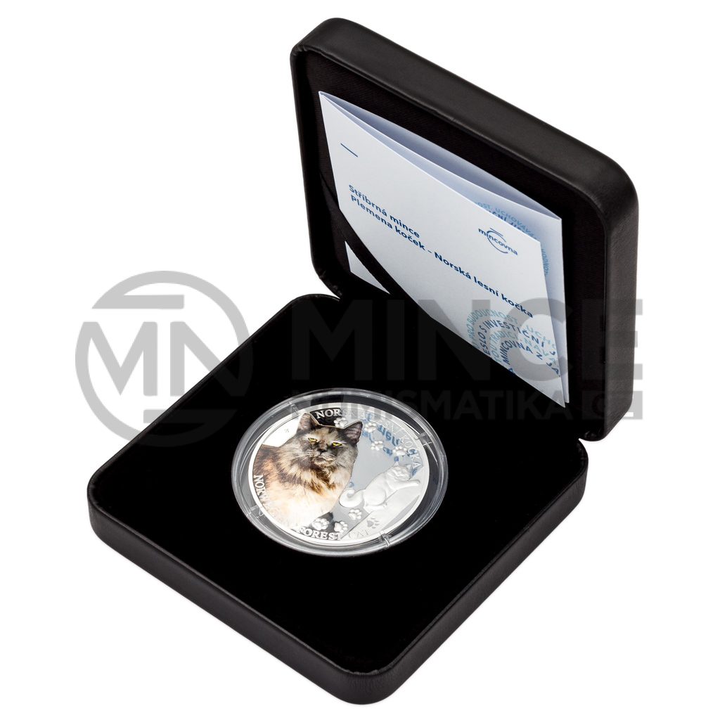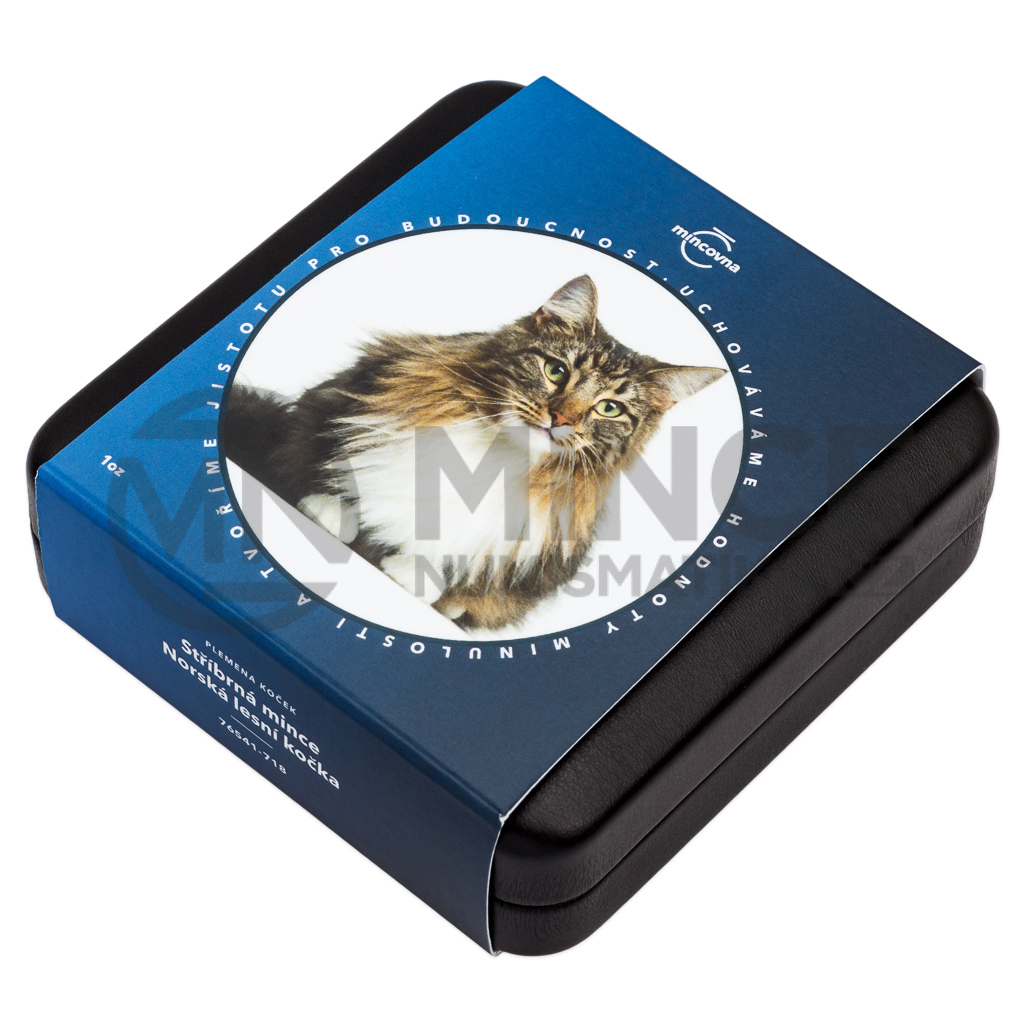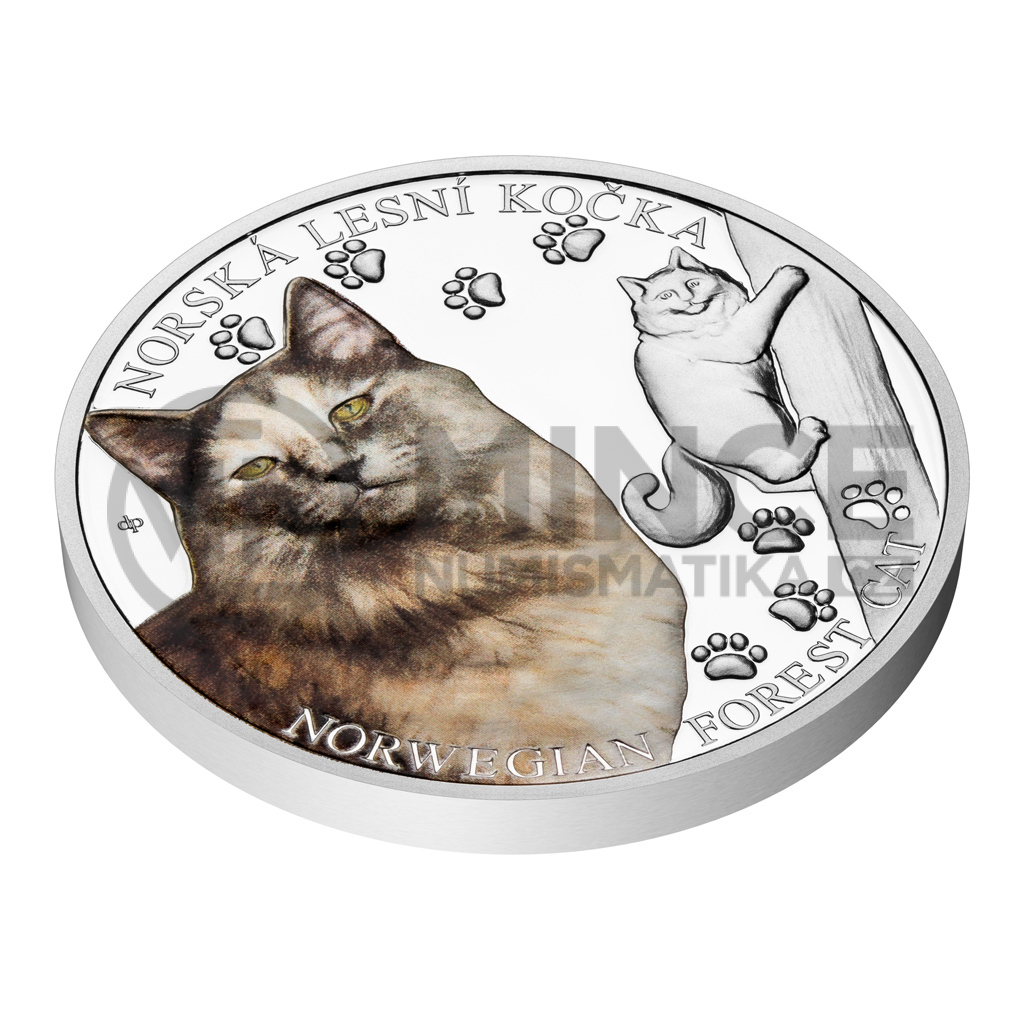 Na deváté stříbrné minci České mincovny z cyklu Plemena koček se objevuje norská lesní kočka.