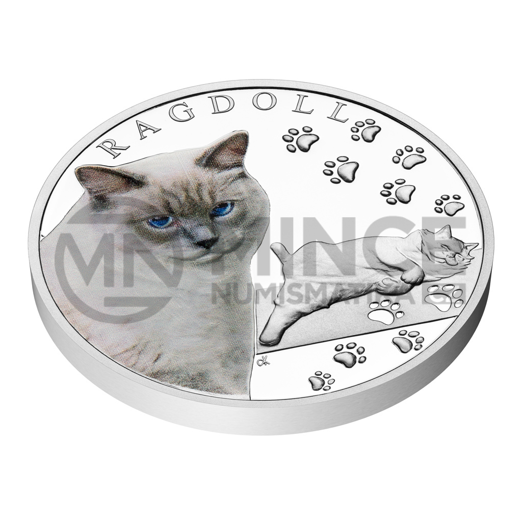 Na reverzní straně mince, která je dílem medailéra Davida Kružliaka, se ragdoll objevuje hned dvakrát. První vyobrazení je kolorované, a tak dává vyniknout barevné srsti. Druhé, které je reliéfní, předkládá uvolněnou kočku ležící na zádech. Kompozici dotváří opis RAGDOLL. Na averzní straně, která je společná celému cyklu, pak najdete siluetu kočky a otisky tlapek. Protože mince České mincovny vycházejí v zahraniční licenci ostrova Niue, nesou na averzu ještě jeho státní znak, nominální hodnotu 1 DOLLAR (NZD) a rok emise 2025.