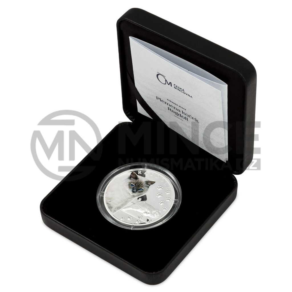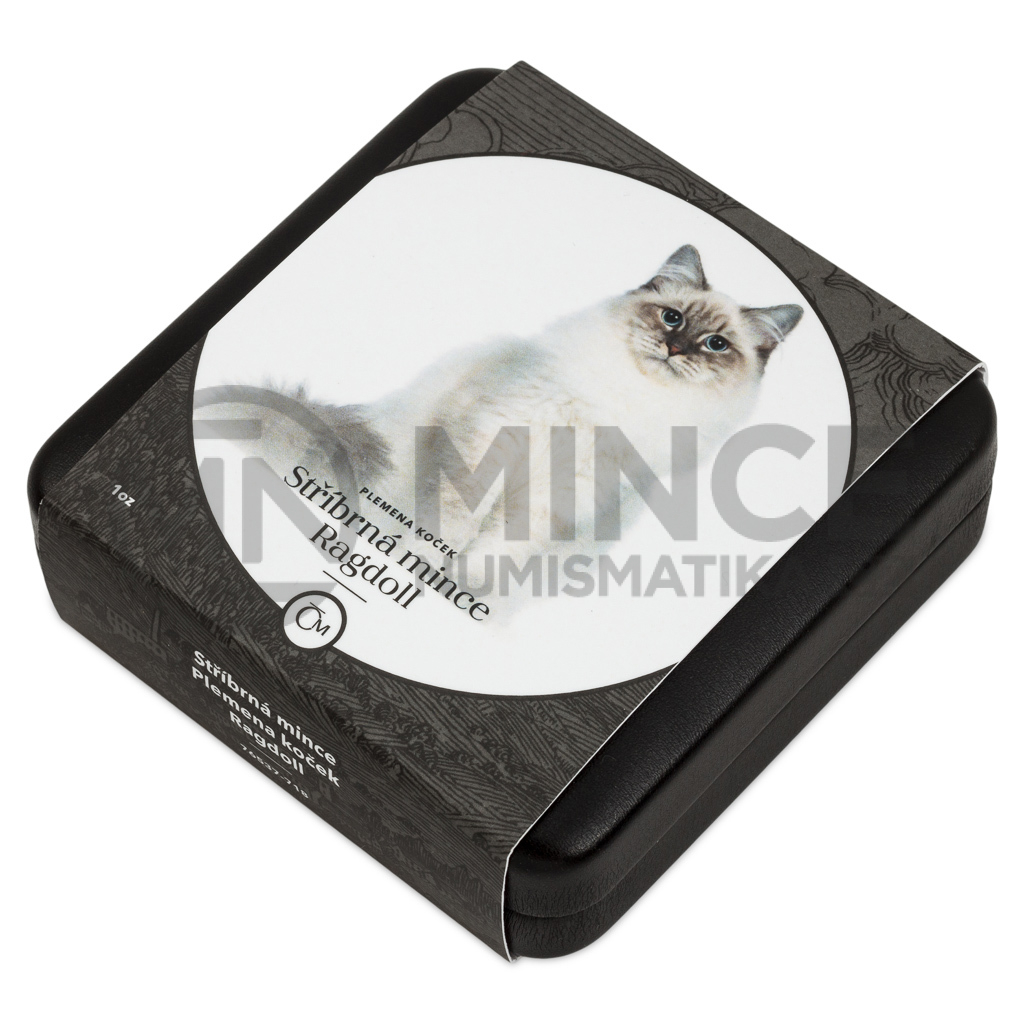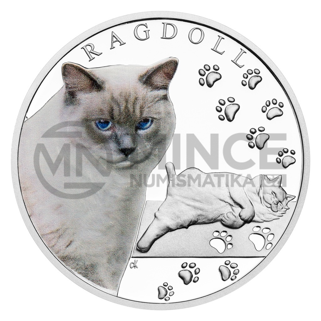 Na páté stříbrné minci České mincovny z cyklu Plemena koček se objevuje ragdoll.