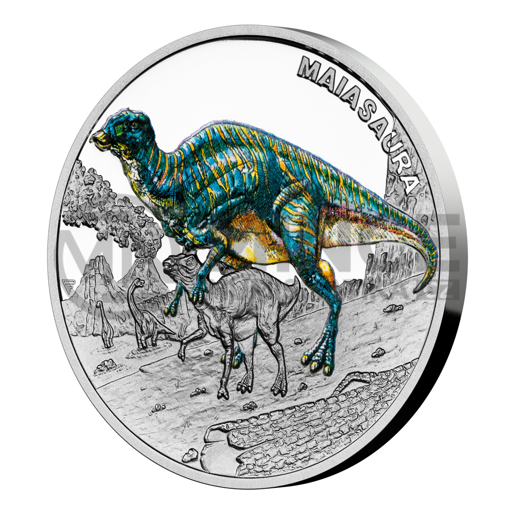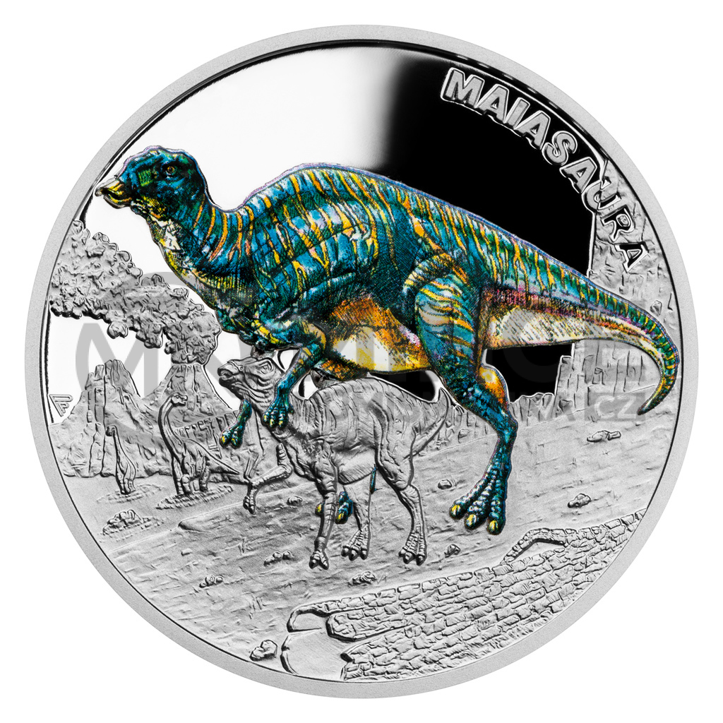 Šestým druhohorním ještěrem, který se objevuje na stříbrné minci České mincovny z cyklu Pravěký svět, je maiasaura.
