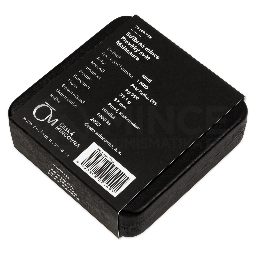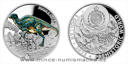 Reverzní stranu mince věnoval medailér Petr Patka, DiS., vyobrazení kachnozobé maiasaury v živých barvách, kterých bylo docíleno pomocí technologie kolorování. Jako předloha nebyly použity fotografie nebo počítačová grafika – autor mince vytvořil originální malbu. Ražený reliéf předkládá odrostlé mládě maiasaury v druhohorní divočině. Kompozici reverzu uzavírá opis MAIASAURA. Averzní strana mince, která je společná celému cyklu, pak nese zkamenělou kostru tyrannosaura a anglický opis PREHISTORIC WORLD (Pravěký svět). Protože licenci k vydávání pamětních mincí České mincovny poskytuje tichomořský ostrov Niue, nese averz ještě jeho nezbytné atributy – státní znak, nominální hodnotu 1 DOLLAR (NZD) a rok vydání 2023.