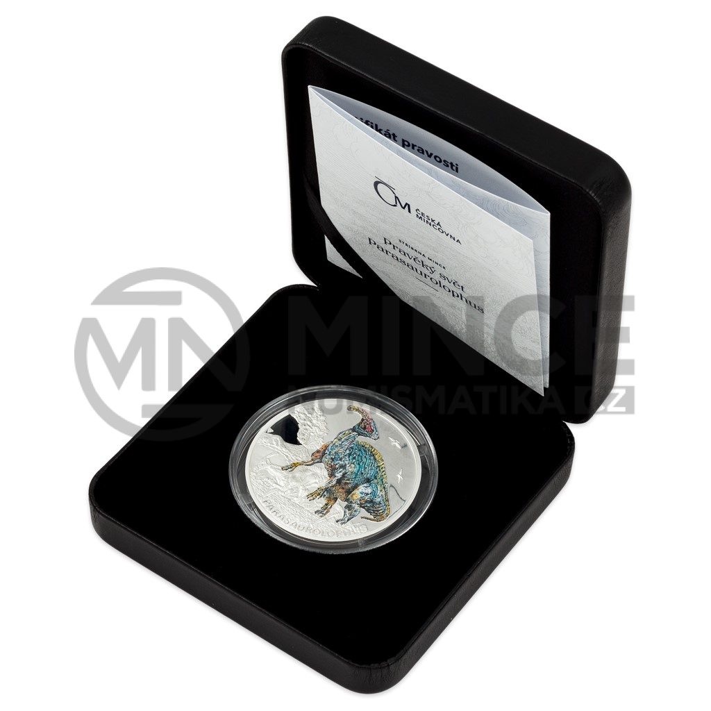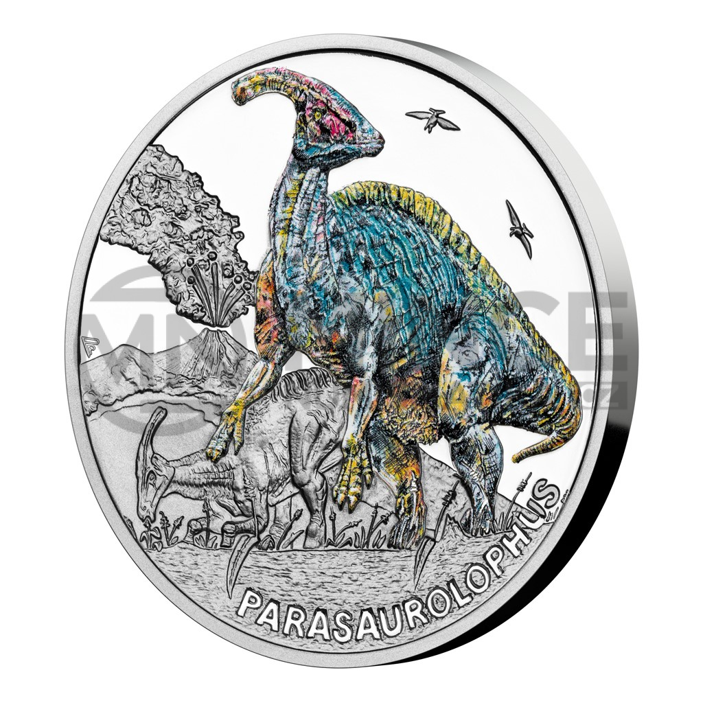 Pátým druhohorním ještěrem, který se objevuje na stříbrné minci České mincovny z cyklu Pravěký svět, je parasaurolophus.