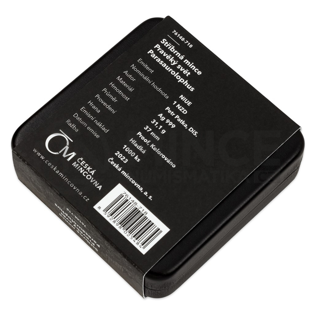Reverzní stranu mince věnoval medailér Petr Patka, DiS., vyobrazení kachnozobého parasaurolopha v živých barvách, kterých bylo docíleno pomocí technologie kolorování. Jako předloha nebyly použity fotografie nebo počítačová grafika – autor mince vytvořil originální malbu. V raženém reliéfu je patrná druhohorní divočina s dalším pasoucím se parasaurolophem. Kompozici reverzu uzavírá opis PARASAUROLOPHUS. Averzní strana mince, která je společná celému cyklu, pak předkládá zkamenělou kostru tyrannosaura a anglický opis PREHISTORIC WORLD (Pravěký svět). Protože licenci k vydávání pamětních mincí České mincovny poskytuje tichomořský ostrov Niue, nese averz ještě jeho nezbytné atributy – státní znak, nominální hodnotu 1 DOLLAR (NZD) a rok vydání 2023.