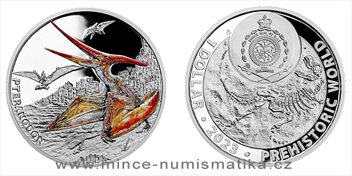 Reverzní stranu mince věnoval medailér Petr Patka, DiS., vyobrazení sedícího pteranodona v živých barvách, kterých bylo docíleno pomocí technologie kolorování. Jako předloha nebyly použity fotografie nebo počítačová grafika – autor mince vytvořil originální malbu. Ražený reliéf předkládá další ptakoještěry, kteří u pobřeží loví ryby. Kompozici reverzu uzavírá opis PTERANODON. Averzní strana mince, která je společná celému cyklu, pak nese zkamenělou kostru tyrannosaura a anglický opis PREHISTORIC WORLD (Pravěký svět). Protože licenci k vydávání pamětních mincí České mincovny poskytuje tichomořský ostrov Niue, nese averz ještě jeho nezbytné atributy – státní znak, nominální hodnotu 1 DOLLAR (NZD) a rok vydání 2023.