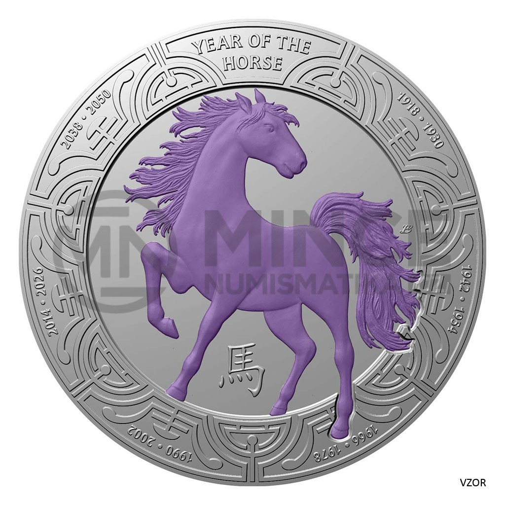 Medailérka Petra Brodská, DiS., věnovala reverzní stranu mince kolorovanému vyobrazení koně, které doplnila příslušným čínským symbolem a anglickým opisem YEAR OF THE HORSE (rok koně). Do dekoru, který oře obklopuje, zakomponovala letopočty 20. a 21. století, na které připadá rok koně. Protože mince České mincovny vycházejí v zahraniční licenci státu Samoa, nesou na averzní straně jeho státní znak, letopočet emise 2026 a nominální hodnotu 2 DOLLARS (WST). Kompozici averzu dotvářejí ještě další dva vzpínající se koně.