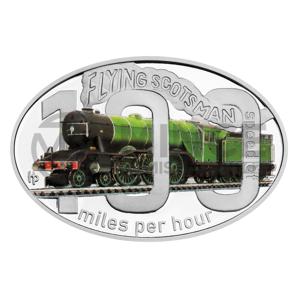Reverzní strana mince, která je dílem medailéra Mgr. Petra Horáka, předkládá lokomotivu projíždějící nulami v nápisu SPEED OF 100 MILES PER HOUR (rychlost 100 mil za hodinu). Do kouře, který se line z komína, je zakomponován její název FLYING SCOTSMAN. Charakteristický zelený nátěr lokomotivy byl vytvořen s pomocí technologie kolorování. Averzní strana mince, která je společná celému cyklu, pak předkládá železniční koleje a tunel. Protože mince České mincovny vycházejí v zahraniční licenci ostrova Niue, nesou na averzní straně ještě jeho státní znak, nominální hodnotu 1 DOLLAR (NZD) a rok emise 2024.