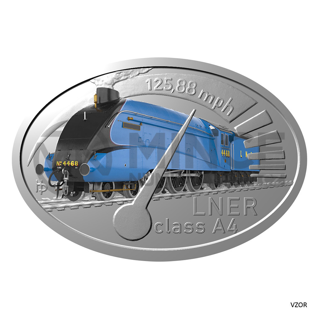 Na páté kolorované stříbrné minci České mincovny z cyklu s názvem Slavné lokomotivy se objevuje Mallard, který je synonymem rychlosti.