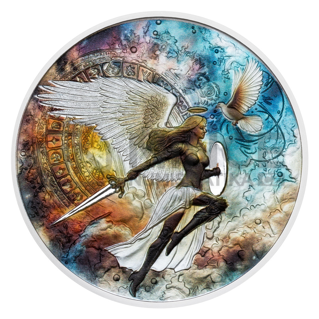 Na bohatě kolorované reverzní straně mince vyobrazil medailér Petr Patka, DiS., zosobněné dobro v podobě plavé ženy s mečem, svatozáří a bílými perutěmi. Bojovnice za sebou nechává nebeská oblaka a v doprovodu holubice vyráží skrz magický portál do boje proti zlu. Nebeské království najdete také na averzní straně mince, kde jeho zářící věže kontrastují s pustou pekelnou říší. Protiklady představují i dva opeřenci – holubice a havran, které obklopují mystické ornamenty a symboly. Protože mince České mincovny vycházejí v zahraniční licenci ostrova Niue, nesou na averzu ještě jeho státní znak, nominální hodnotu 5 DOLLARS (NZD) a rok emise 2025.