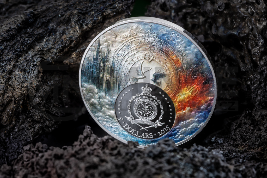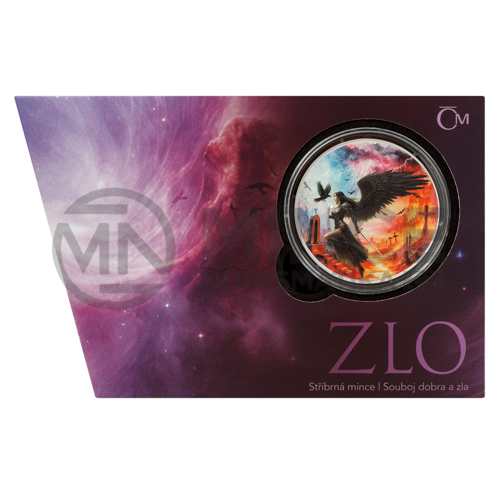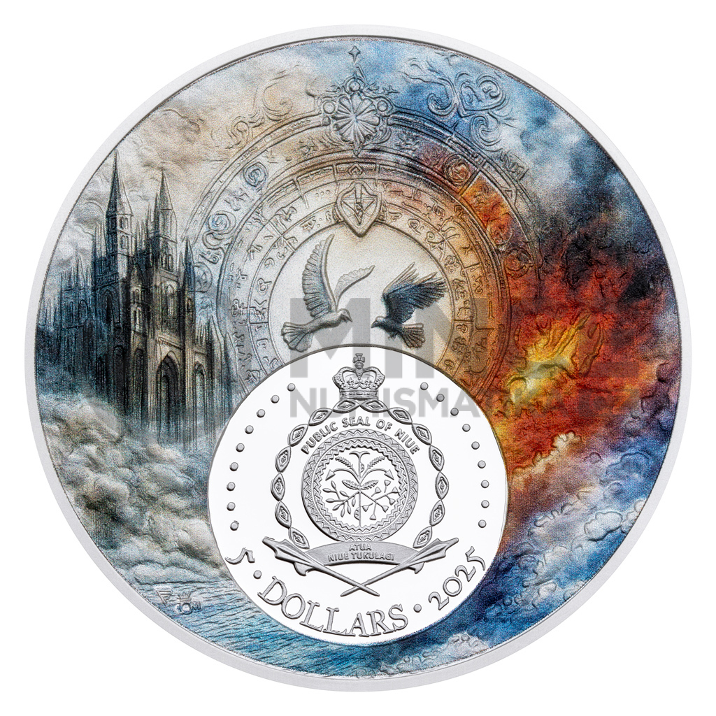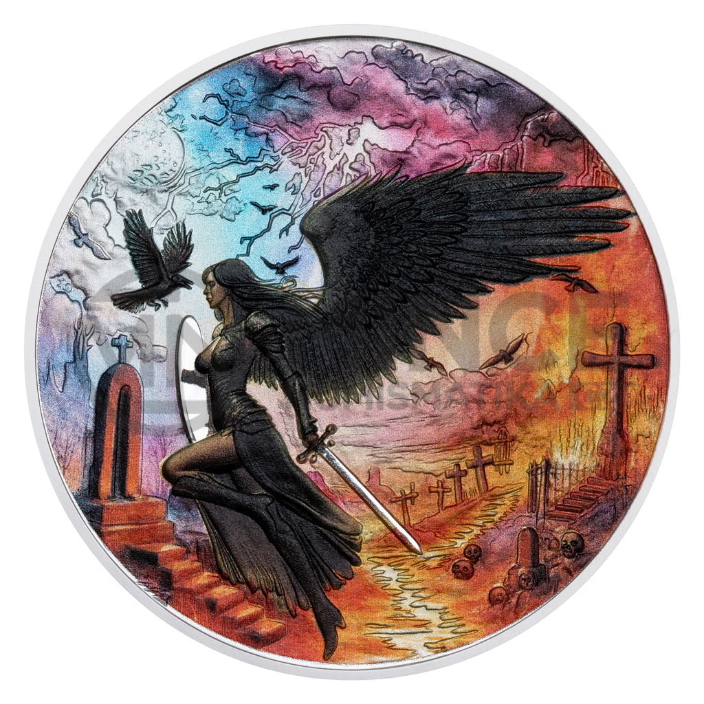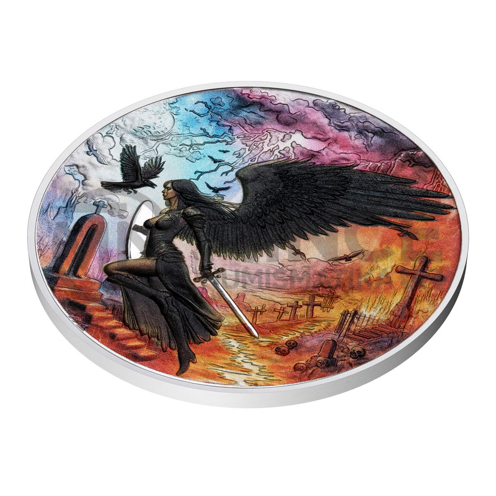 Na bohatě kolorované reverzní straně mince vyobrazil medailér Petr Patka, DiS., zosobněné zlo v podobě temné ženy s mečem a černými perutěmi. Válečnice za sebou nechává hořící peklo plné hrobů a v doprovodu havranů vyráží do boje proti dobru. Pustou pekelnou říši najdete také na averzní straně mince, kde kontrastuje se zářícími věžemi nebeského království. Protiklady představují i dva opeřenci – havran a holubice, které obklopují mystické ornamenty a symboly. Protože mince České mincovny vycházejí v zahraniční licenci ostrova Niue, nesou na averzu ještě jeho státní znak, nominální hodnotu 5 DOLLARS (NZD) a rok emise 2025.