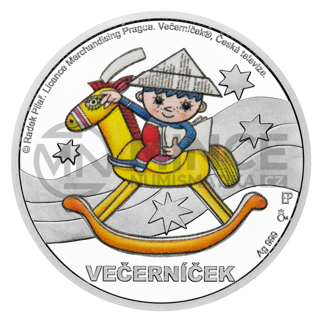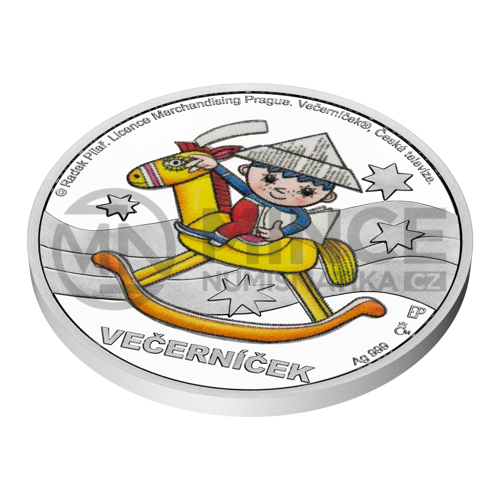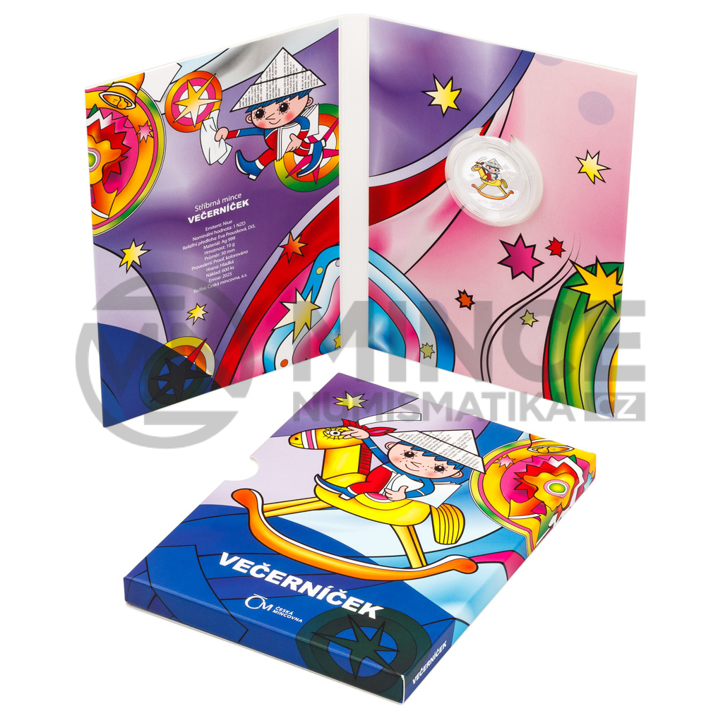 Pamětní mince, která vychází z originálního díla Radka Pilaře, je dílem medailérky Evy Prouskové, DiS. Na averzní straně najdete Večerníčka tak, jak ho znáte – na hlavě má papírovou čepici, sedí na houpacím koníkovi a rozhazuje listy pohádkových příběhů. Díky technologii kolorování je postavička vyvedena v živých barvách. Protože mince České mincovny vycházejí v zahraniční licenci ostrova Niue, nesou na averzu ještě portrét krále Karla III., nominální hodnotu 1 DOLLAR (NZD) a rok emise 2025.