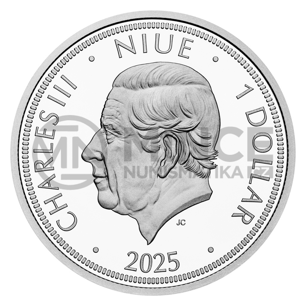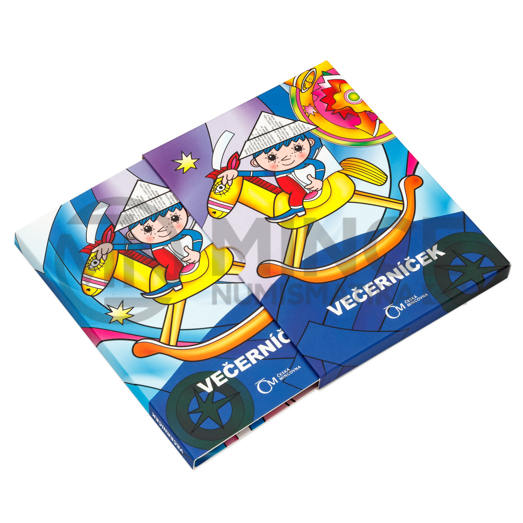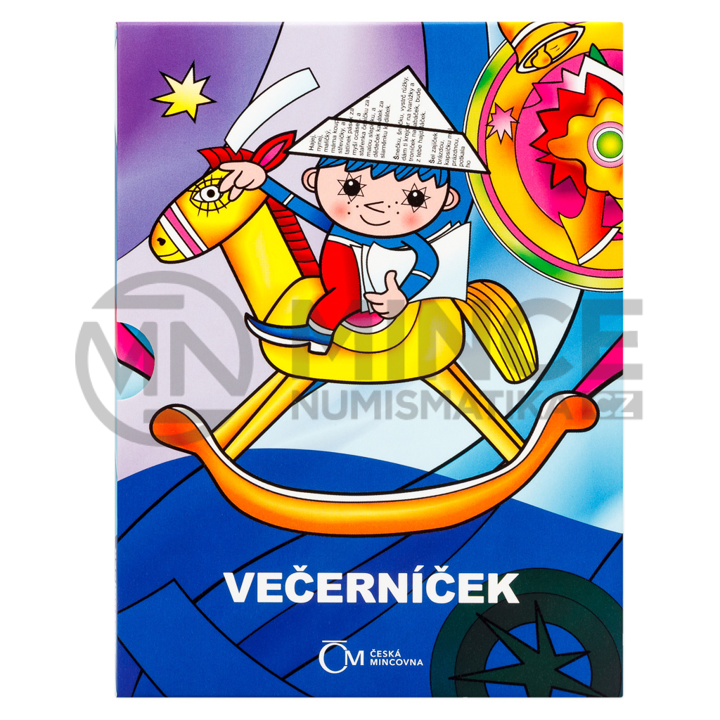 Pamětní mince, která vychází z originálního díla Radka Pilaře, je dílem medailérky Evy Prouskové, DiS. Na averzní straně najdete Večerníčka tak, jak ho znáte – na hlavě má papírovou čepici, sedí na houpacím koníkovi a rozhazuje listy pohádkových příběhů. Díky technologii kolorování je postavička vyvedena v živých barvách. Protože mince České mincovny vycházejí v zahraniční licenci ostrova Niue, nesou na averzu ještě portrét krále Karla III., nominální hodnotu 1 DOLLAR (NZD) a rok emise 2025.