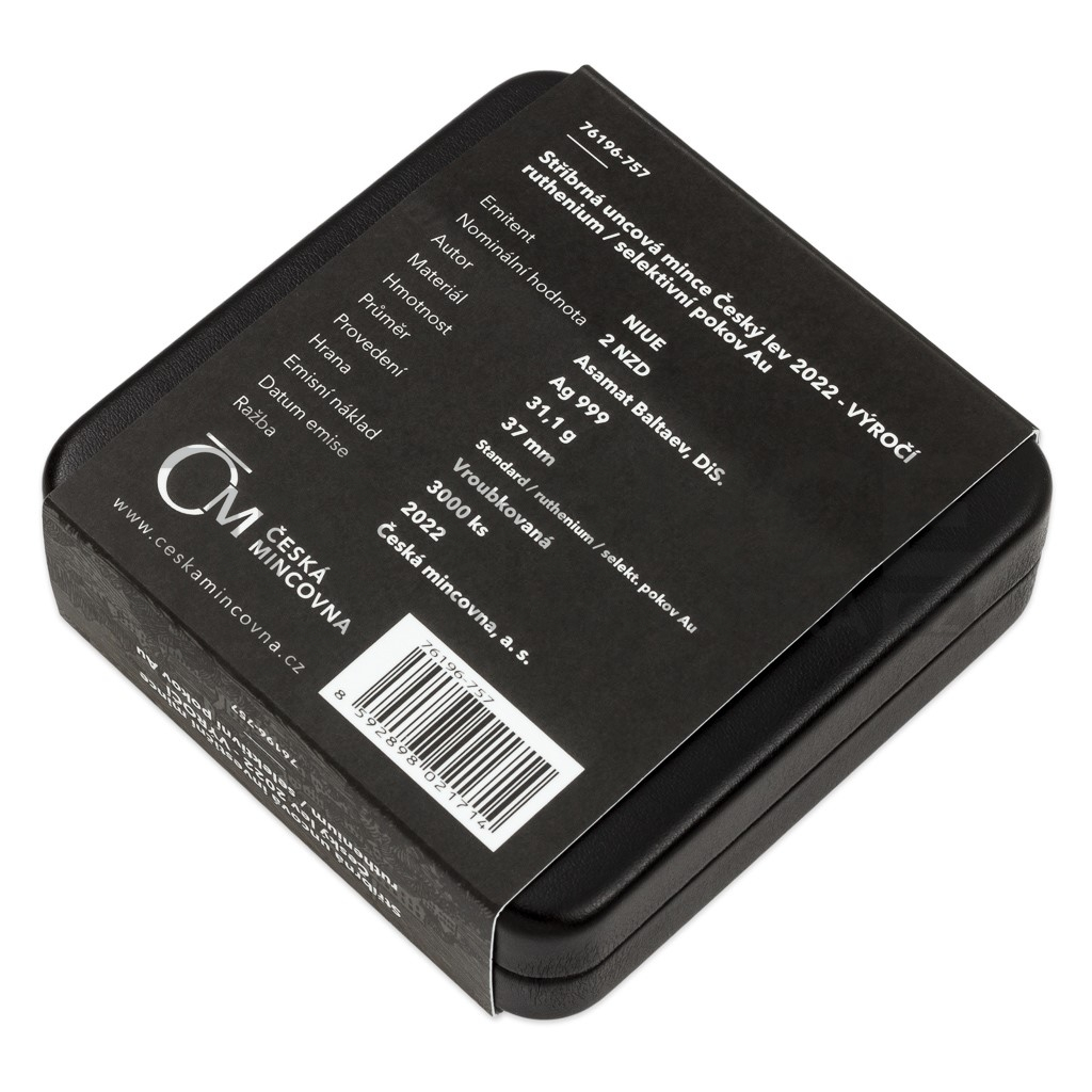 Mimořádná varianta investiční mince Český lev vyniká promyšlenou hrou barev, jež se v mincovnictví často nevidí. Stříbrná ražba je pokryta vrstvičkou šedočerného ruthenia – ušlechtilého materiálu, který je nejvzácnějším z triády platinových kovů. Ústřední reliéf je pak ještě selektivně pozlacen, což minci propůjčuje výrazný kontrastní vzhled.