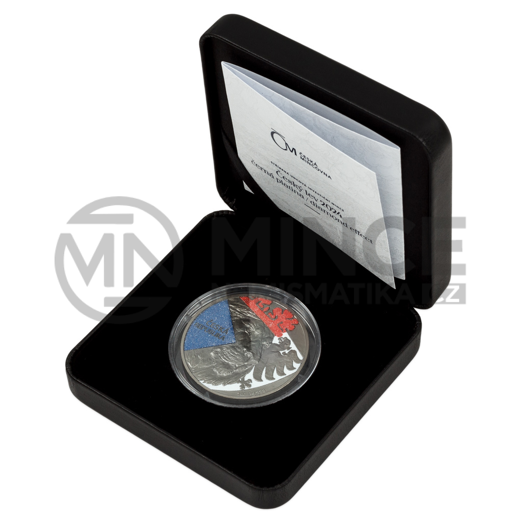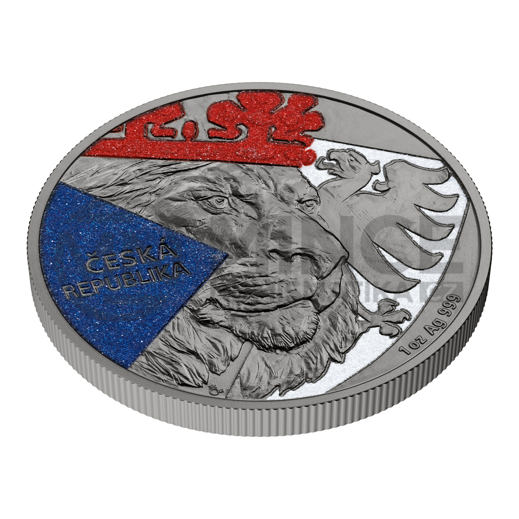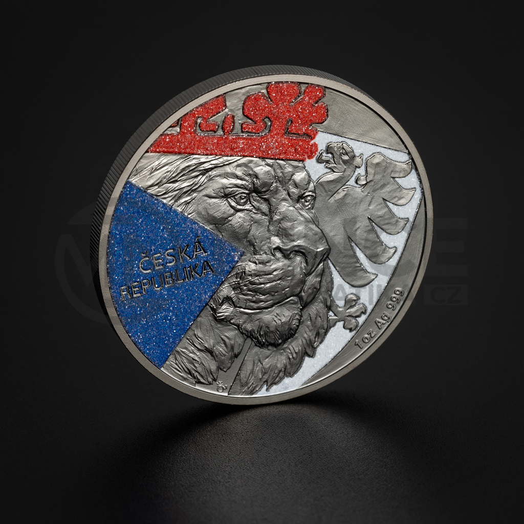 Mimořádná varianta investiční mince Český lev vyniká promyšlenou hrou barev, jež se v mincovnictví často nevidí. Stříbrná ražba je pokryta vrstvičkou černé platiny – ušlechtilého materiálu, který se ve srovnání se stříbrem či zlatem vyznačuje vyšší tvrdostí, hustotou i odolností. Vybrané detaily reliéfu jsou pak zvýrazněny třpytivým prachem v barvách české trikolóry, kterými jsou bílá, červená a modrá.