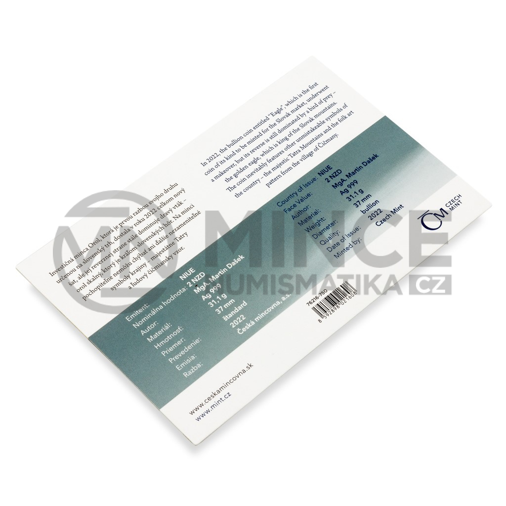 Světové investiční mince bývají věnovány silným národním symbolům a ani „Orol“, který je první ražbou svého druhu určenou pro slovenský trh, není výjimkou. Hmotnost stříbrné mince České mincovny s ročníkem 2022 činí jednu trojskou unci.