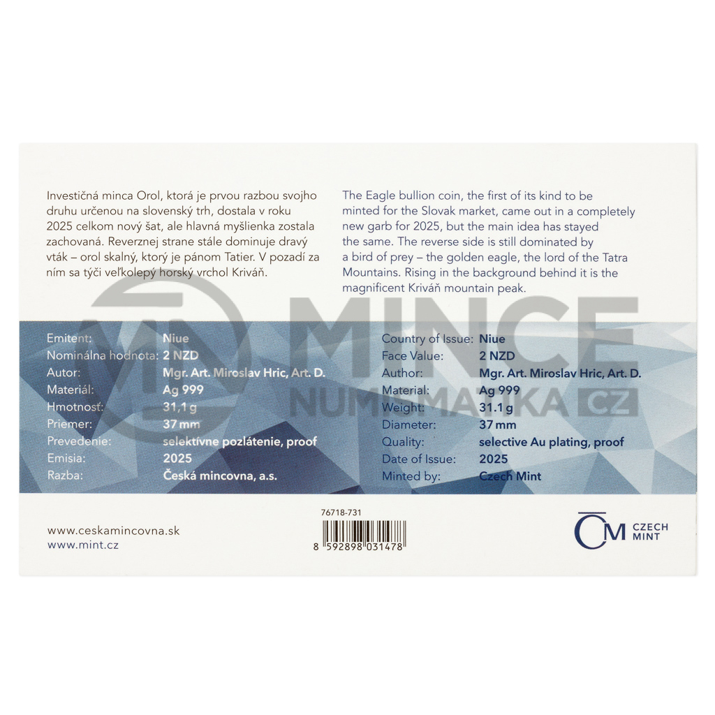 Světové investiční mince bývají věnovány silným národním symbolům a ani „Orol“, který je první ražbou svého druhu určenou pro slovenský trh, není výjimkou. Hmotnost stříbrné mince České mincovny s ročníkem 2025, která se může pochlubit špičkovou kvalitou proof a také selektivním pozlacením, činí jednu trojskou unci. Mince je vůbec poprvé číslována na hraně!