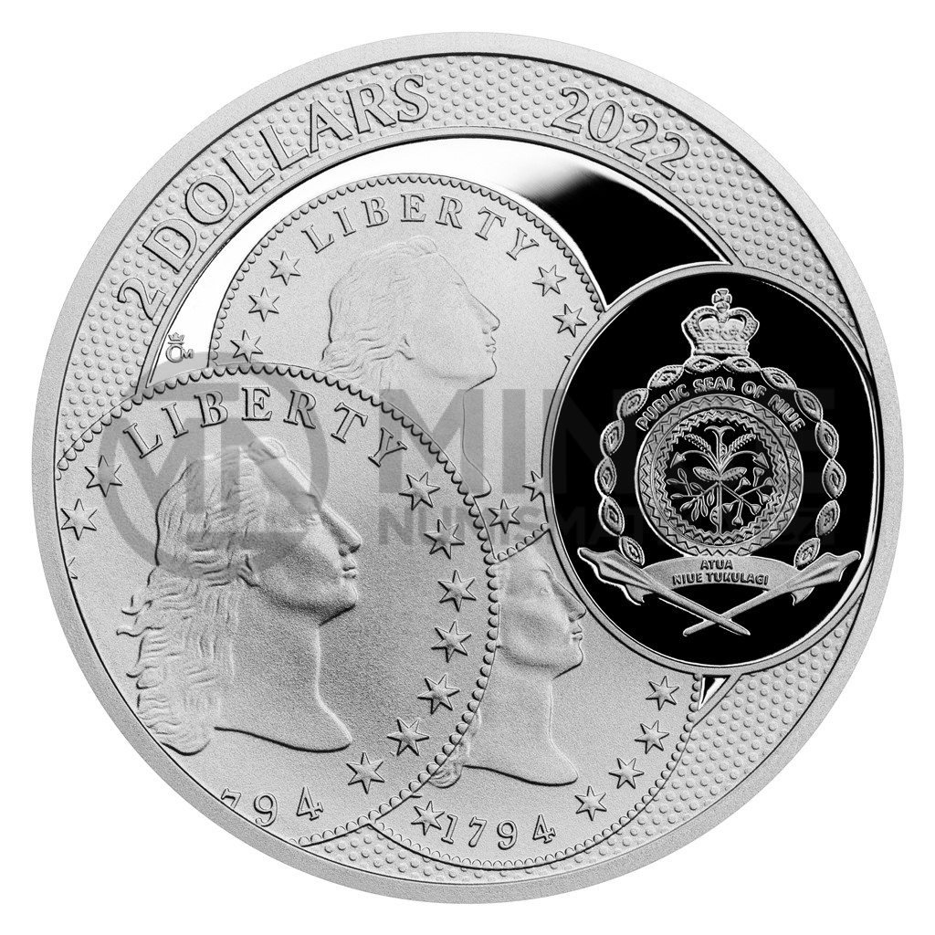 Zatímco reverzní strana mince, která je dílem designéra Ladislava Vraného a medailéra MgA. Martina Daška, předkládá tři jáchymovské tolary, na averzu najdete trojici amerických dolarů. Konkrétně se jedná o motiv úplně prvních mincí ražených Spojenými státy v roce 1794, které si od svého českého prapředka vypůjčily nejen jméno, ale také váhu a ryzost použitého kovu. Protože mince České mincovny vycházejí v licenci zahraničního emitenta, kterým je ostrov Niue, jejich averzní strana nese ještě jeho nezbytné atributy – státní znak, nominální hodnotu 2 DOLLARS (NZD) a rok emise 2022.