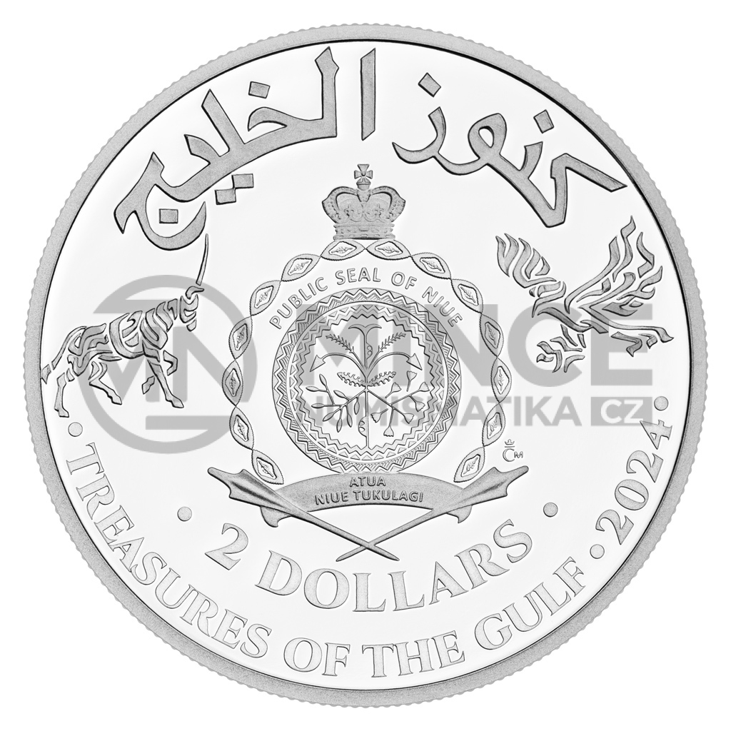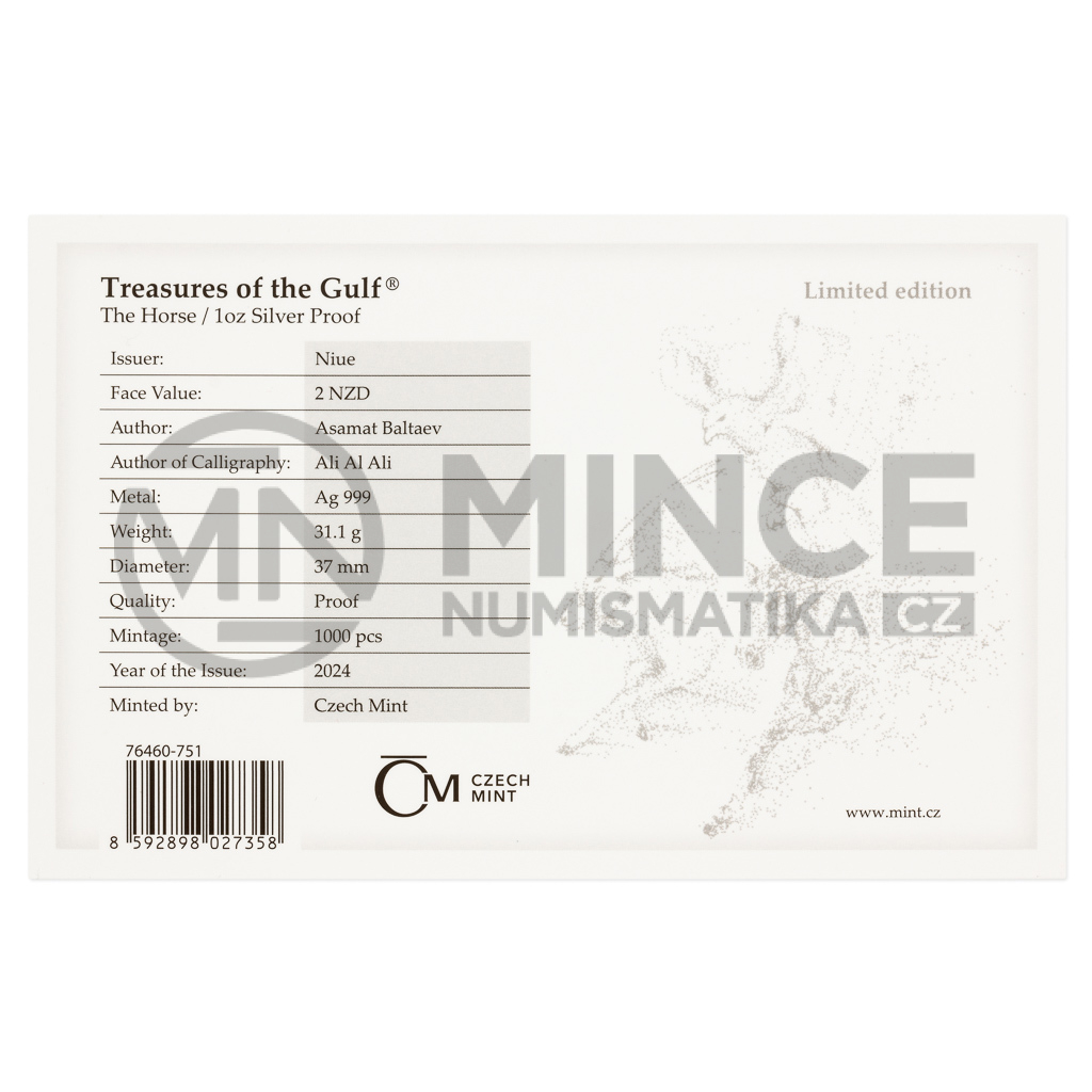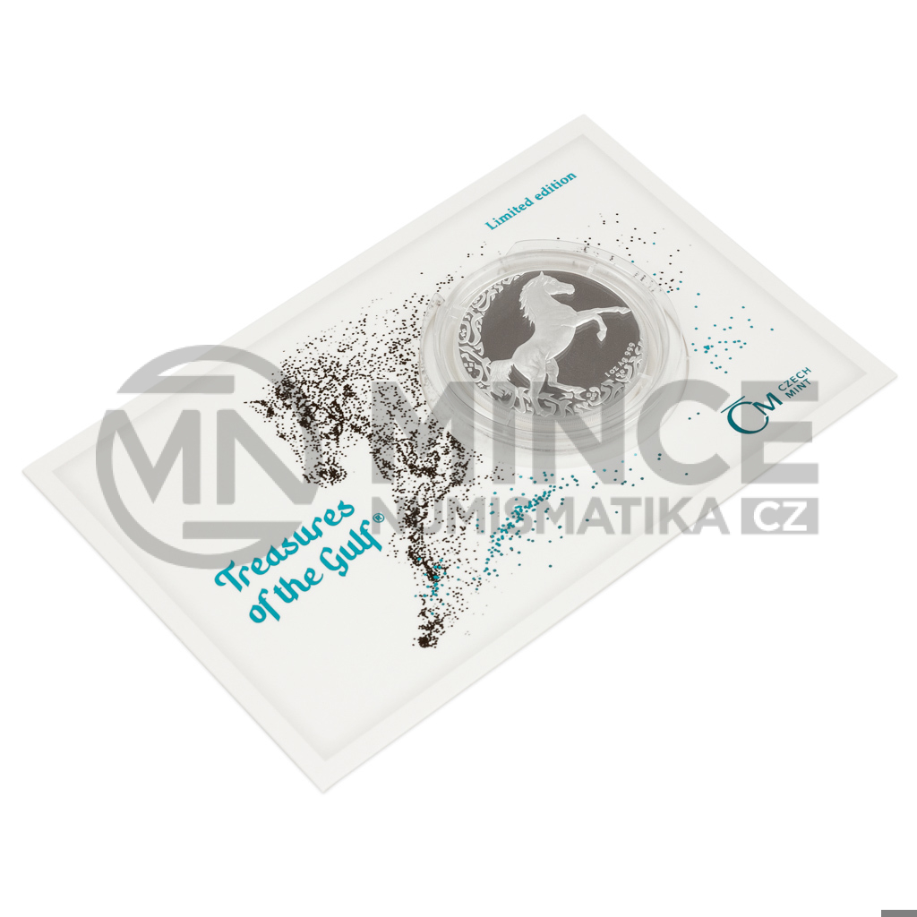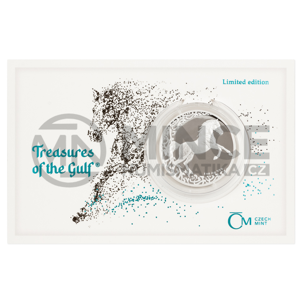 Řada investičních mincí s názvem „Treasures of the Gulf“ – čili „Poklady Zálivu“ – vznikla pro zákazníky České mincovny na Středním východě, ale osloví každého, kdo chce ozvláštnit své portfolio. Hmotnost stříbrné mince s motivem arabského koně a s ročníkem 2024 činí jednu trojskou unci.