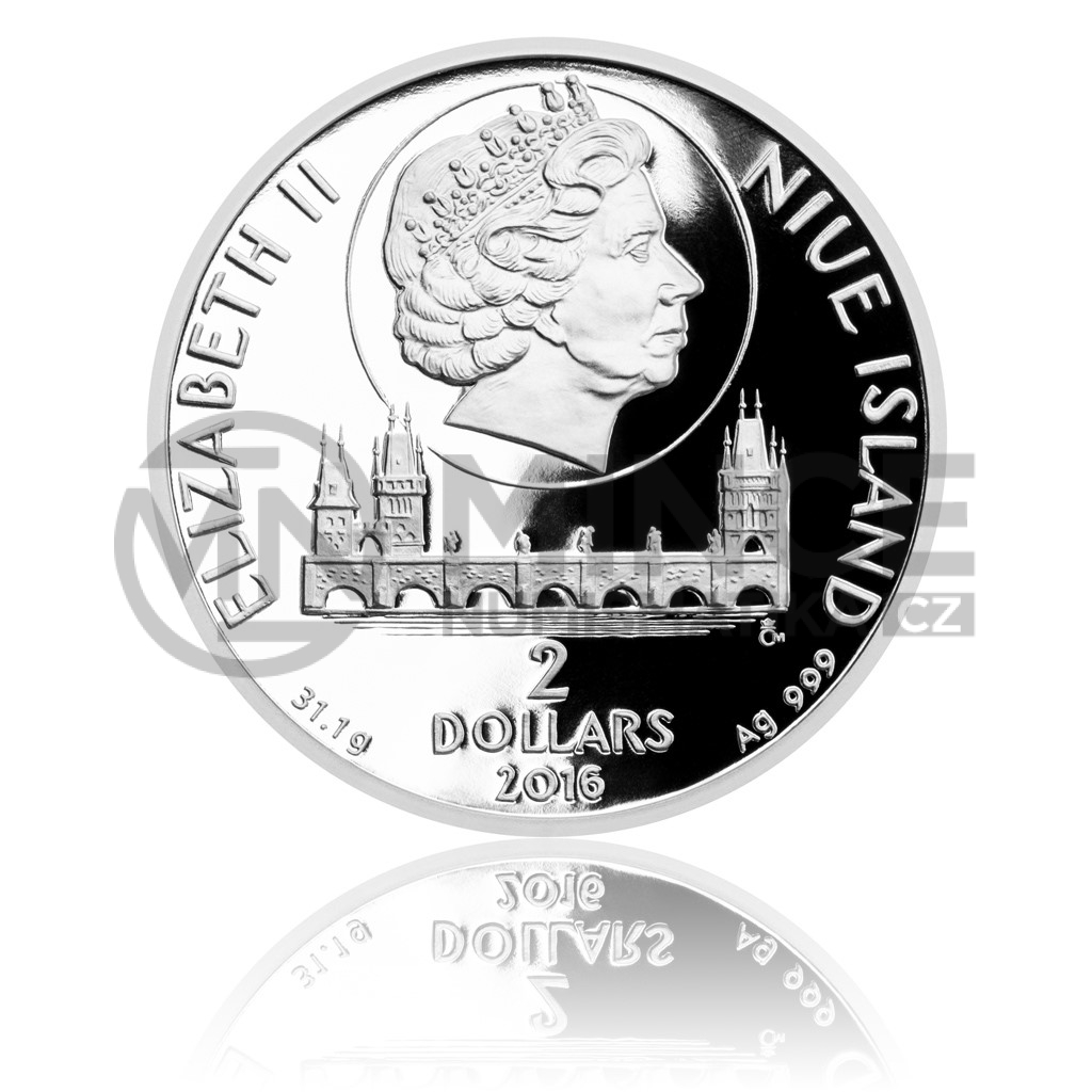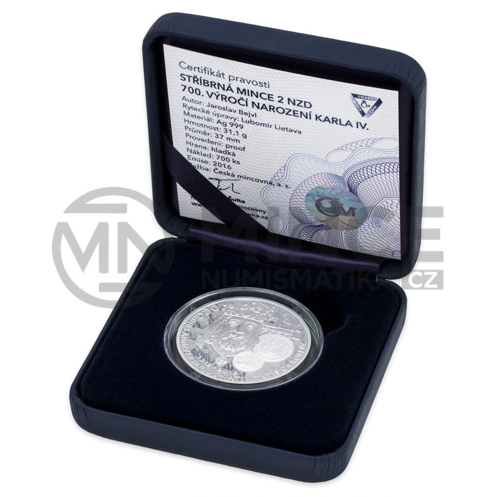 Jejich autorem je špičkový medailér Jaroslav Bejvl, jehož tvorbu se nebojíme přirovnat k dílům Mikoláše Alše. Reverzu mince dominuje charismatický portrét Otce vlasti, který je doplněn pečetěmi Karla IV. a Karlovy univerzity a vyobrazením několika významných pražských pamětihodností – Pražského hradu, Starého Města pražského a Karlova mostu. K jubilejním letopočtům 1316–2016 se vztahuje latinský nápis DCC. DIES ANNIVERSARIUS NATIVITATIS CAROLI IV., tedy 700. výročí narození Karla IV. Averzní strana je věnována celkovému pohledu na Karlův most, nezbytným atributům emitenta, roku emise 2016 a nominální hodnotě mince 2 DOLLARS.