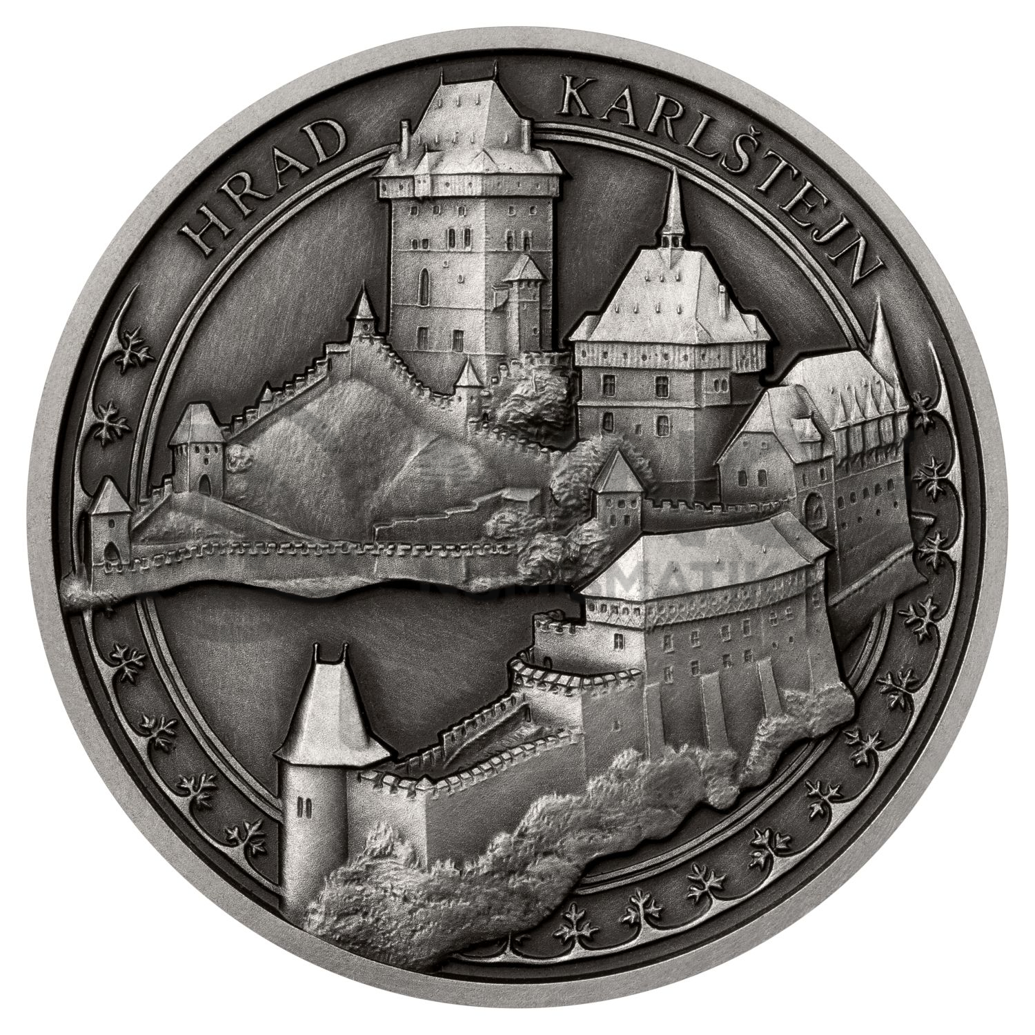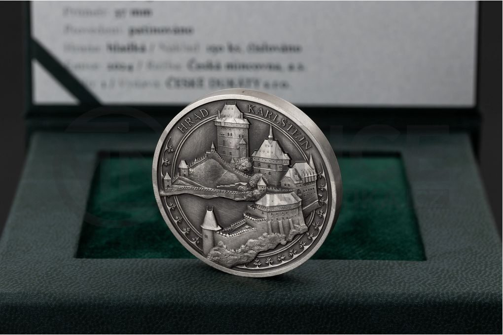 Na averzní straně medaile se majestátně tyčí celý hrad Karlštejn, symbol moci a ochrany českého království. Impozantní věže a hradby vystupují z reliéfu s takovou precizností, že téměř cítíte chlad kamenných zdí a slyšíte ševelení větru nad hradním nádvořím. Okolo hradu se proplétají ozdobné prvky inspirované gotickými detaily z hradní kaple, které jemně propojují architektonickou nádheru s duchovním posláním tohoto místa.