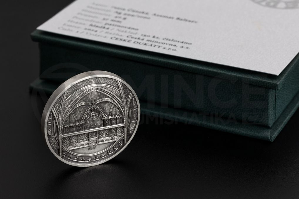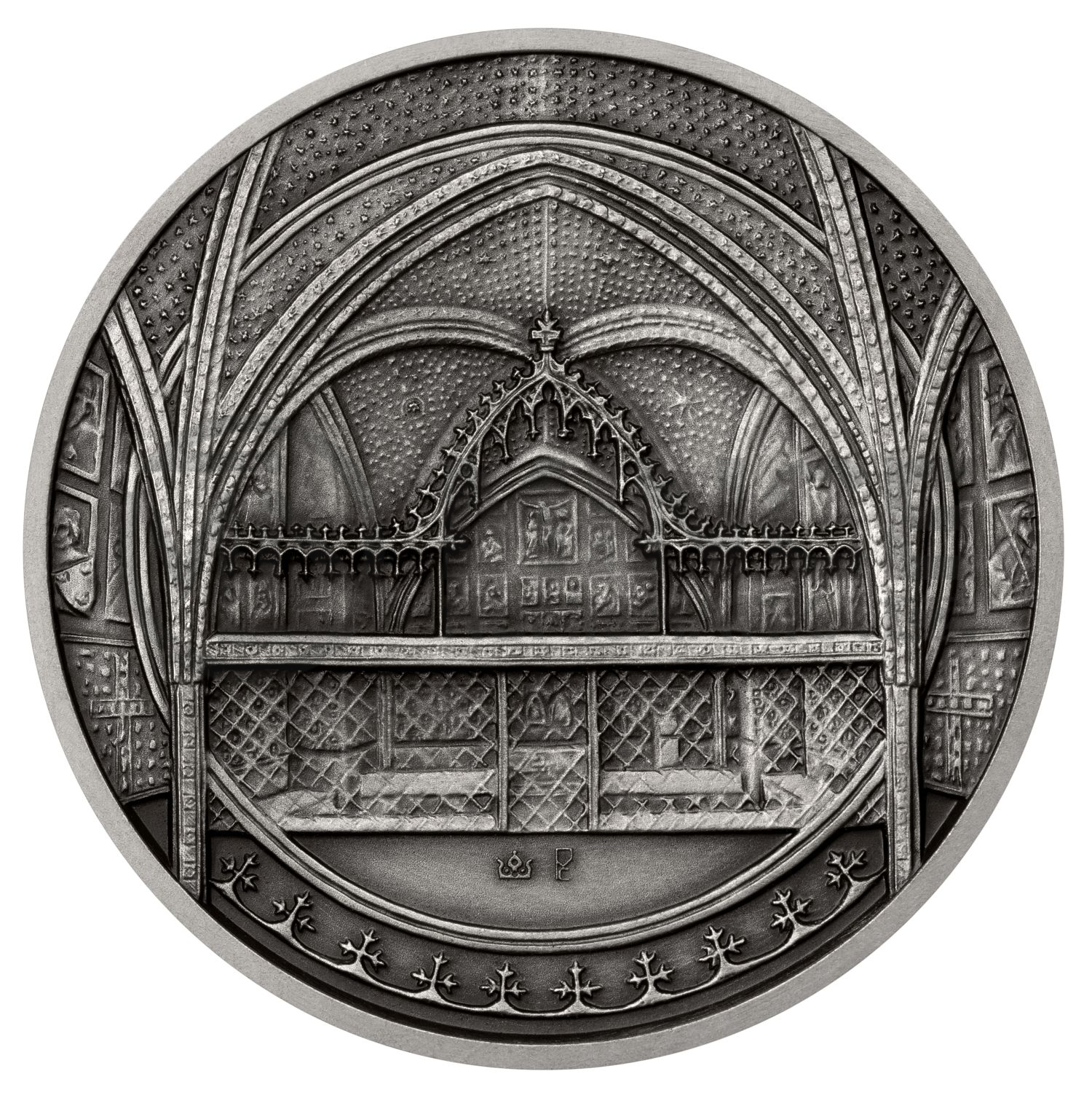 Revers medaile zve obdivovatele do tajemné Karlštejnské kaple, která uchvacuje svou detailností a bohatou výzdobou. Gotické klenby se vznášejí nad oltářem, zdobeným posvátnými motivy a mystickými ornamenty. Právě v této kapli byly po staletí uchovávány korunovační klenoty, střežené samotným Karlem IV. Motiv této strany medaile dokonale zachycuje kouzlo místa, které dodnes vyzařuje posvátnou atmosféru a historický význam.