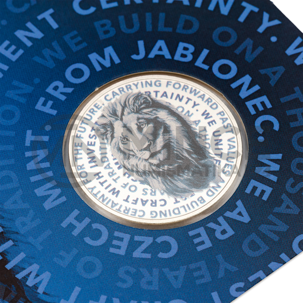 Averzní straně medaile, která je zkrášlena kolorováním, vévodí kresba lva. Majestátní motiv z ateliéru Vojtěcha Dostála, DiS., je obklopen anglickými texty, které vystihují poslání České mincovny. Na reverzní straně pak najdete kolorovanou českou vlajku a QR kód, který směřuje na web České mincovny.