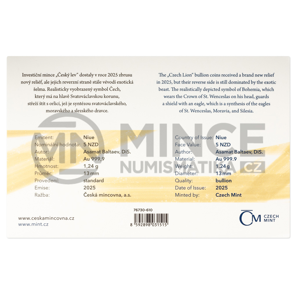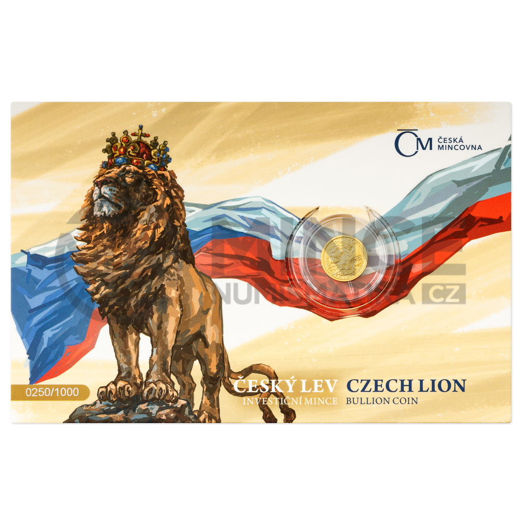Světové investiční mince bývají věnovány silným národním symbolům a ani „Český lev“, který je první ražbou svého druhu určenou pro český trh, není výjimkou. Hmotnost zlaté mince České mincovny s ročníkem 2025 činí jednu pětadvacetinu trojské unce.