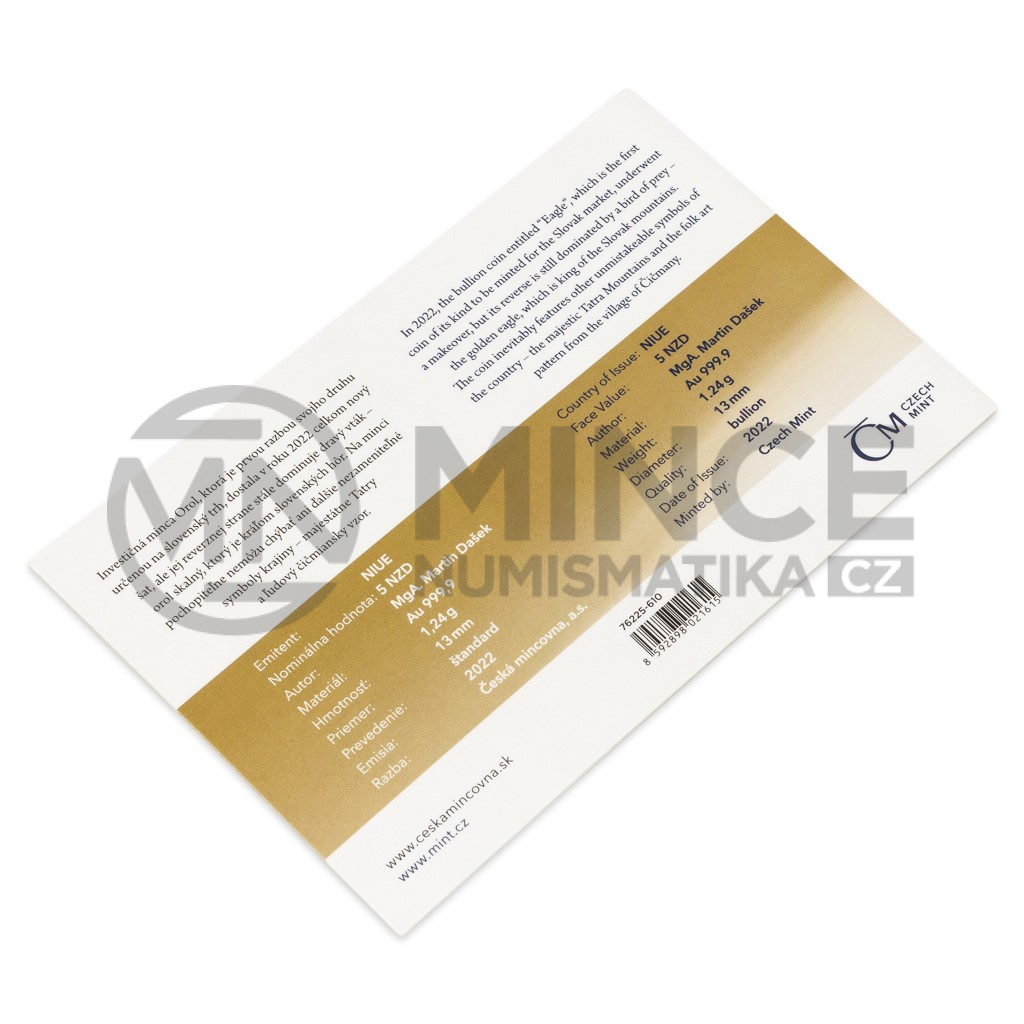 Světové investiční mince bývají věnovány silným národním symbolům a ani „Orol“, který je první ražbou svého druhu určenou pro slovenský trh, není výjimkou. Hmotnost zlaté mince České mincovny s ročníkem 2022 činí jednu pětadvacetinu trojské unce.