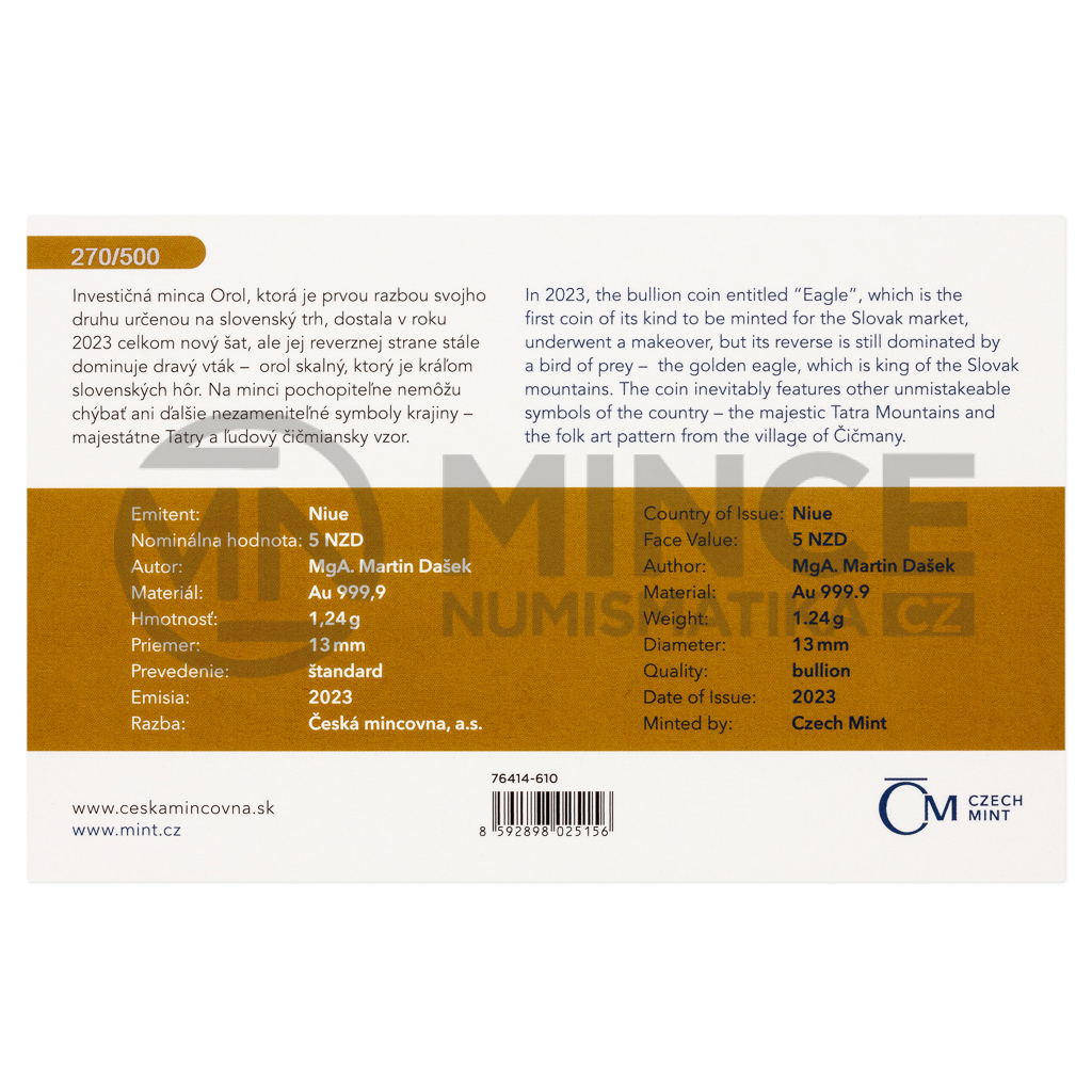 Světové investiční mince bývají věnovány silným národním symbolům a ani „Orol“, který je první ražbou svého druhu určenou pro slovenský trh, není výjimkou. Hmotnost zlaté mince České mincovny s ročníkem 2023 činí jednu pětadvacetinu trojské unce.