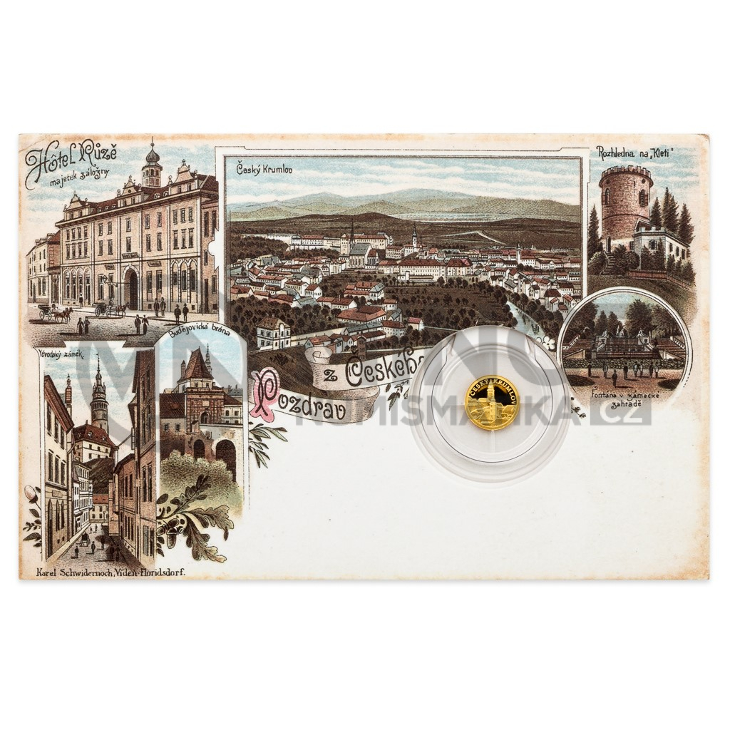 V minulosti si Český Krumlov za své sídlo zvolila celá řada velkých šlechtických rodů – Vítkovci, pánové z Krumlova, Rožmberkové, Eggenbergové či Schwarzenbergové. Ti všichni pečovali o jeho rozvoj a vtiskli mu reprezentativní charakter. Pamětihodnosti Českého Krumlova proslavily jihočeskou metropoli po celém světě a historické jádro města na březích řeky Vltavy bylo zapsáno na seznam světového dědictví UNESCO. Se zájmem turistů souvisí i potřeba celé škály upomínkových předmětů, mezi nimiž nemůže chybět pohlednicová tvorba. Okénkovou litografii, která posloužila jako předloha pro balení mince, vydal věhlasný vídeňský vydavatel Karel Schwidernoch v roce 1899 – v tehdejší době výjimečně s českým textem. „Takzvané litografické pohlednice z 90. let 19. století jsou nejstarším typem pohlednic a jsou sběratelsky nejvíce ceněny. Jejich tvorba byla náročná uměleckým zpracováním i výrobou. Vzhledem k tomu, že tato pohlednice nebyla nikdy odeslána, byla pravděpodobně unikátní součástí soukromé sbírky,“ vysvětluje sběratel Pavel Vursta, který České mincovně poskytuje originální historické pohlednice.