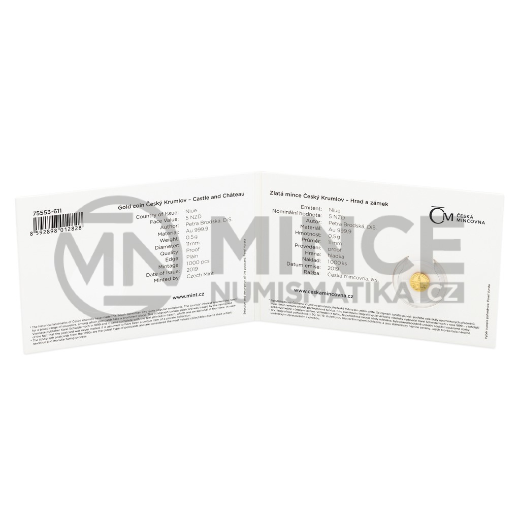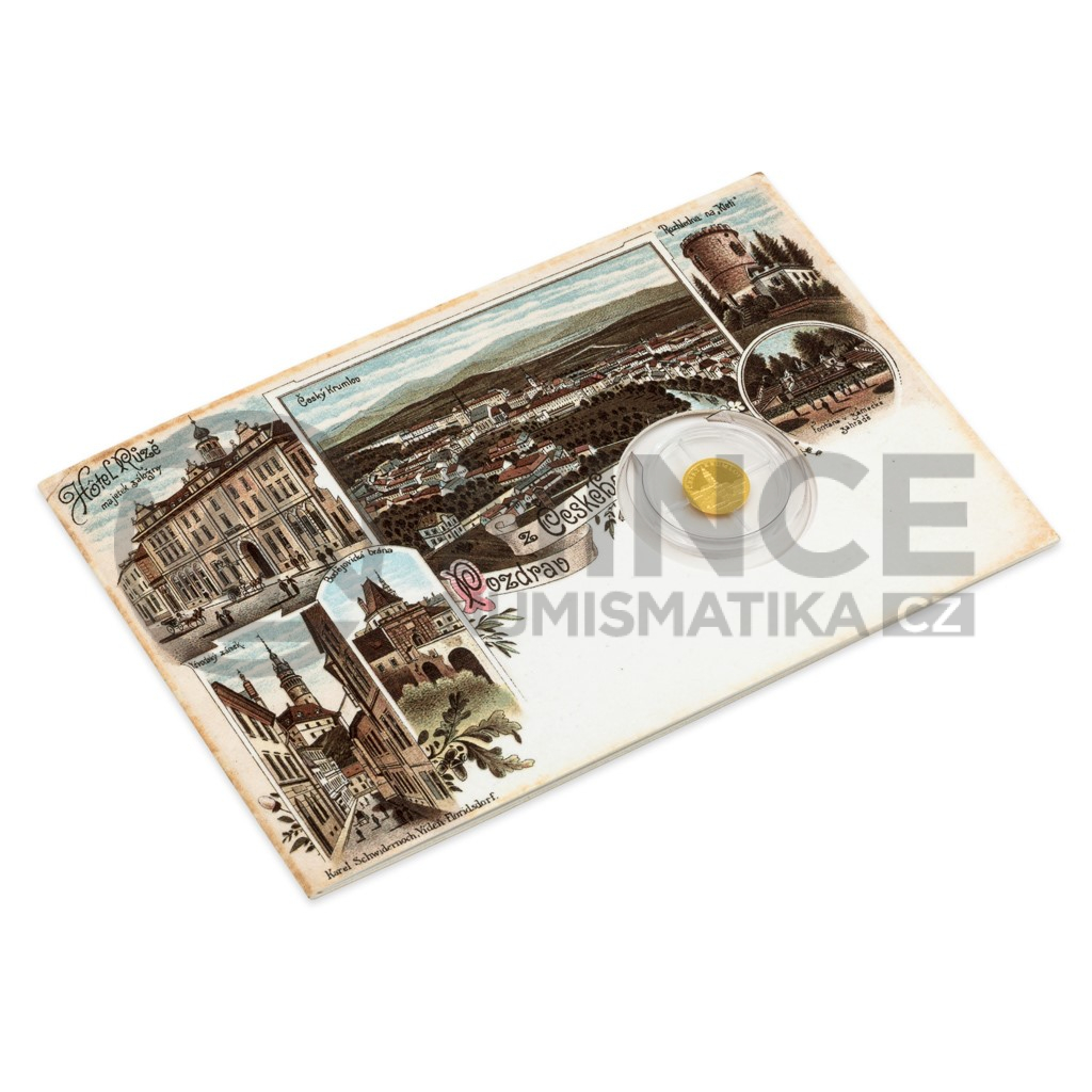 Na zlatých minimincích České mincovny o hmotnosti jedné poloviny gramu, které jsou uloženy do replik dobových pohlednic, se objevují nejkrásnější místa naší vlasti. Není proto divu, že přišla řada na Český Krumlov s jeho nezaměnitelným hradem a zámkem.