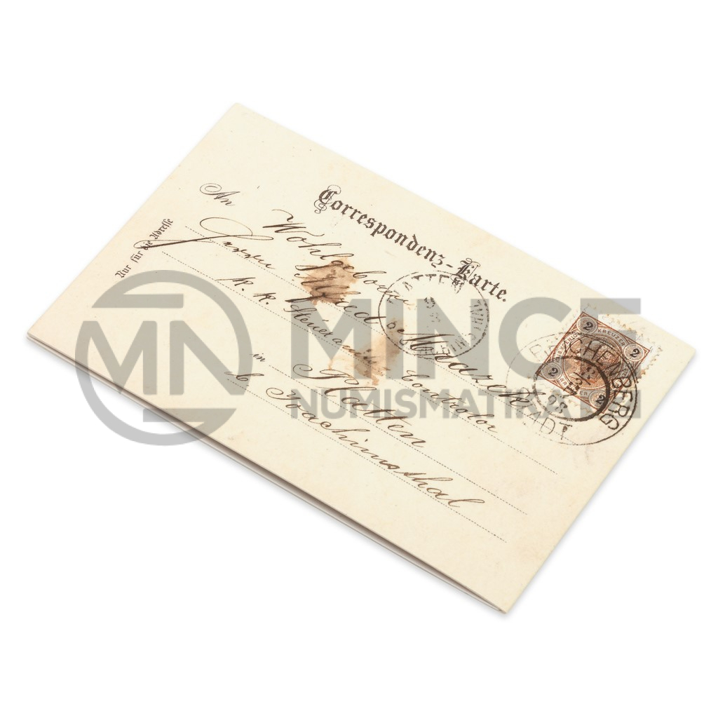 Tisk, který oslavoval půlstoletí habsburského císaře na trůnu, vydal vlastním nákladem Carl Stellzig, c. k. poštmistr v Doubici v Čechách. Dokonale zpracovaná barevná litografie předkládá atributy císařské vlády. Dva portrétní medailony, které zachycují císaře při nástupu na trůn a v době jubilea, jsou zakomponovány do oficiálního znaku monarchie a doplněny figurálním štítkem výročních letopočtů 1848–1898, vysvětlujícím textem a rostlinným motivem. Dalším prvkem kompozice je pohled na vídeňský komplex Hofburg, zimní rezidenci Habsburků. Pohlednice byla na konci 19. století používána jako univerzální pozdrav – za předtištěný německý nápis „Gruss aus“ (pozdrav z) bylo možné ručně dopsat libovolné místo. Konkrétní exemplář, který posloužil jako předloha pro balení mince, byl odeslán 21. května 1899 ze Srbské Kamenice a druhý den doručen do Prahy. Přestože již platila korunová měna, bylo tehdy stále možno použít známku v hodnotě 2 krejcarů.