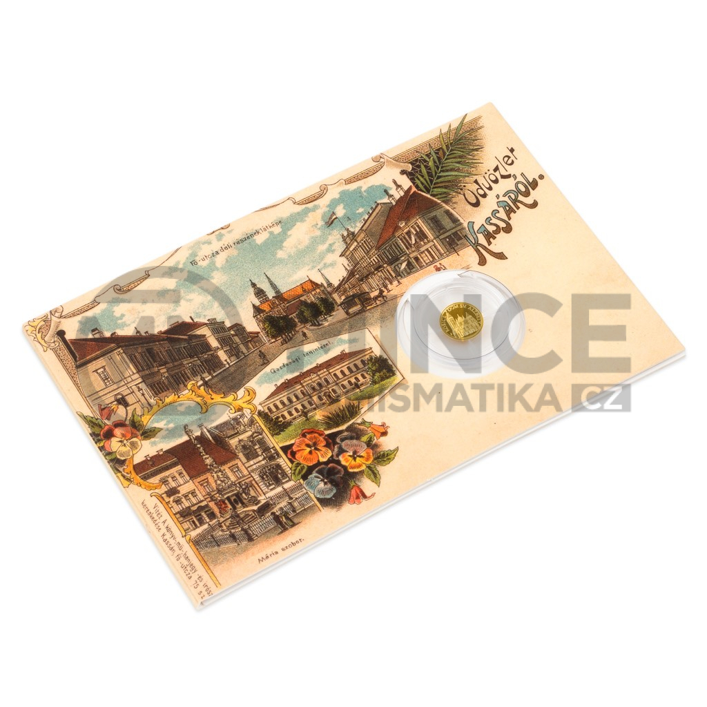Pátá zlatá minimince České mincovny zasazená do repliky historické pohlednice se slovenským motivem připomíná Košice a jejich katedrálu svaté Alžběty.