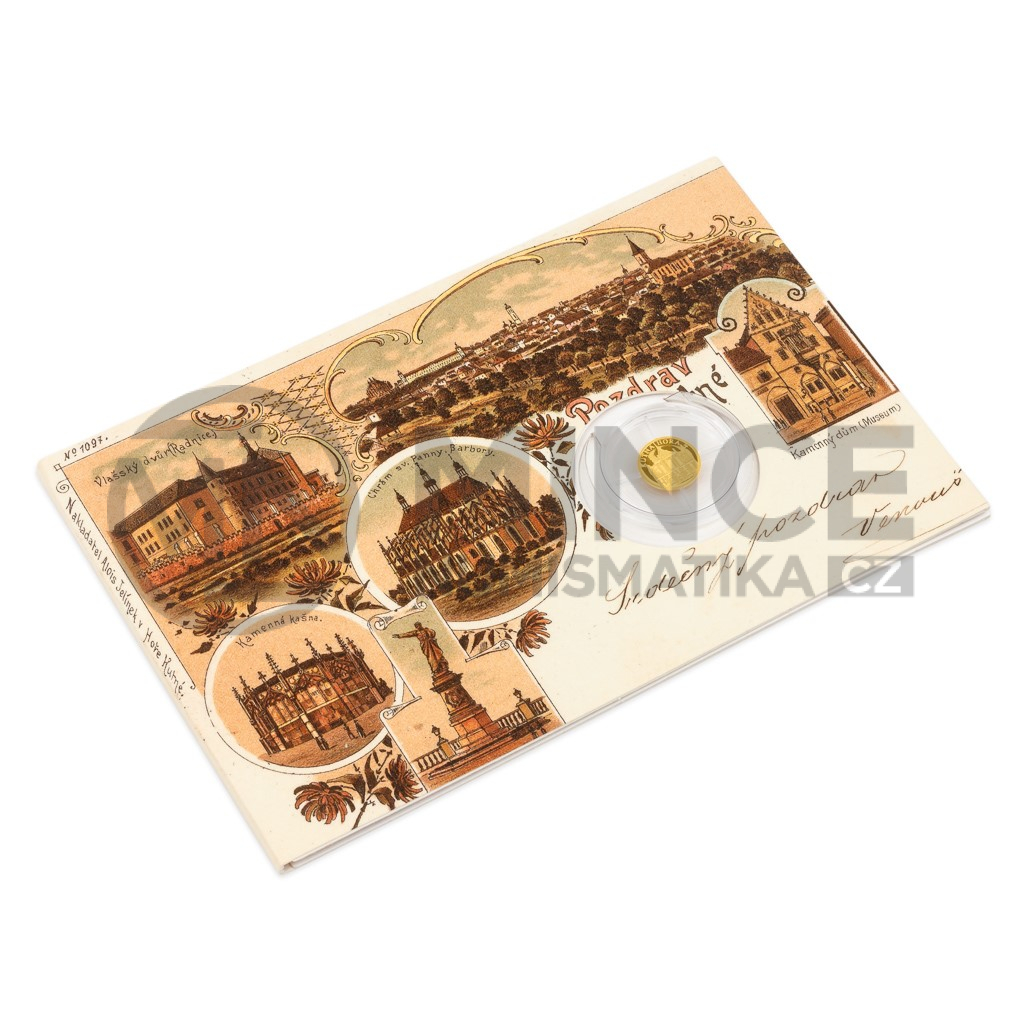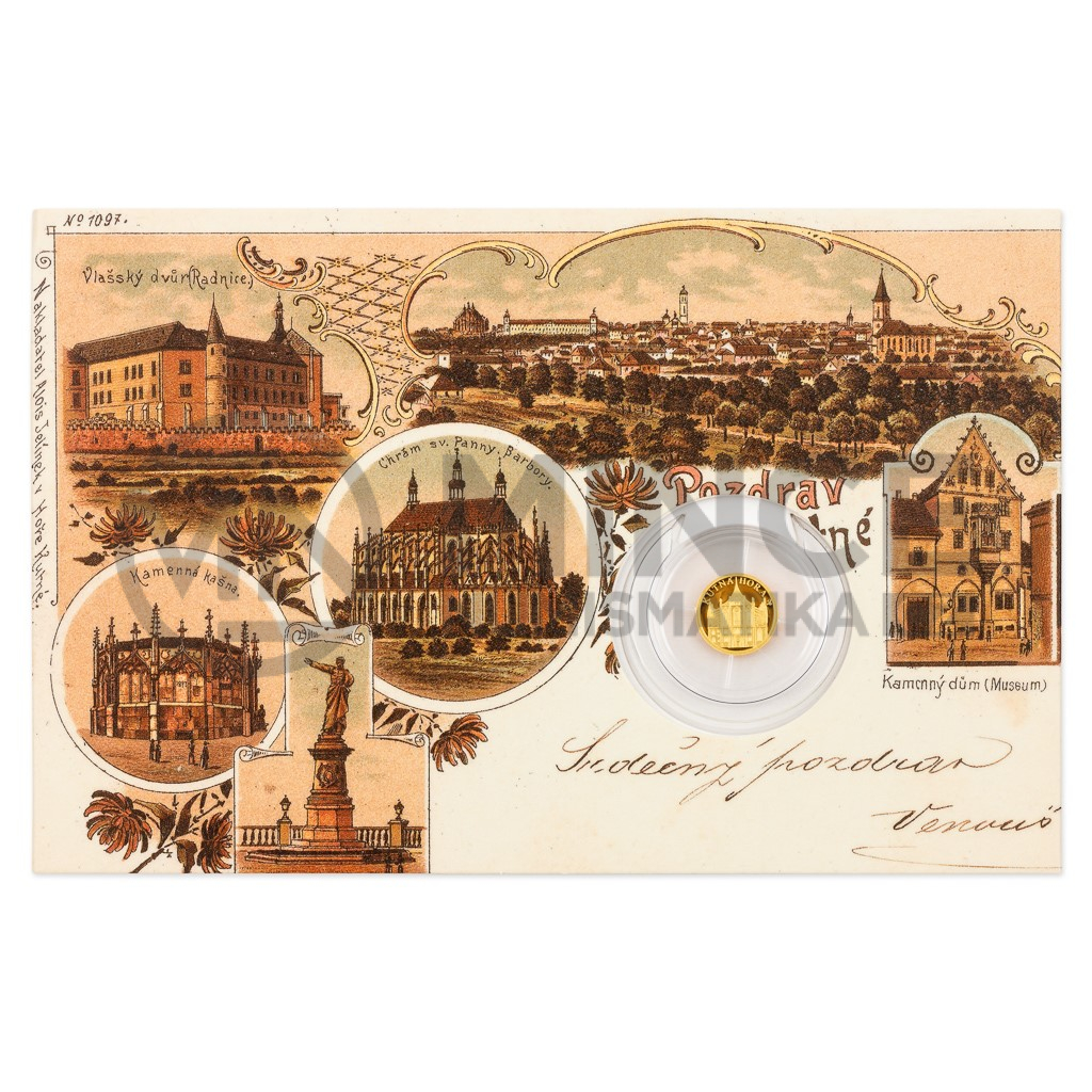 Dalším městem, kterému je věnována zlatá minimince České mincovny zasazená do repliky historické pohlednice, je středočeská Kutná Hora.