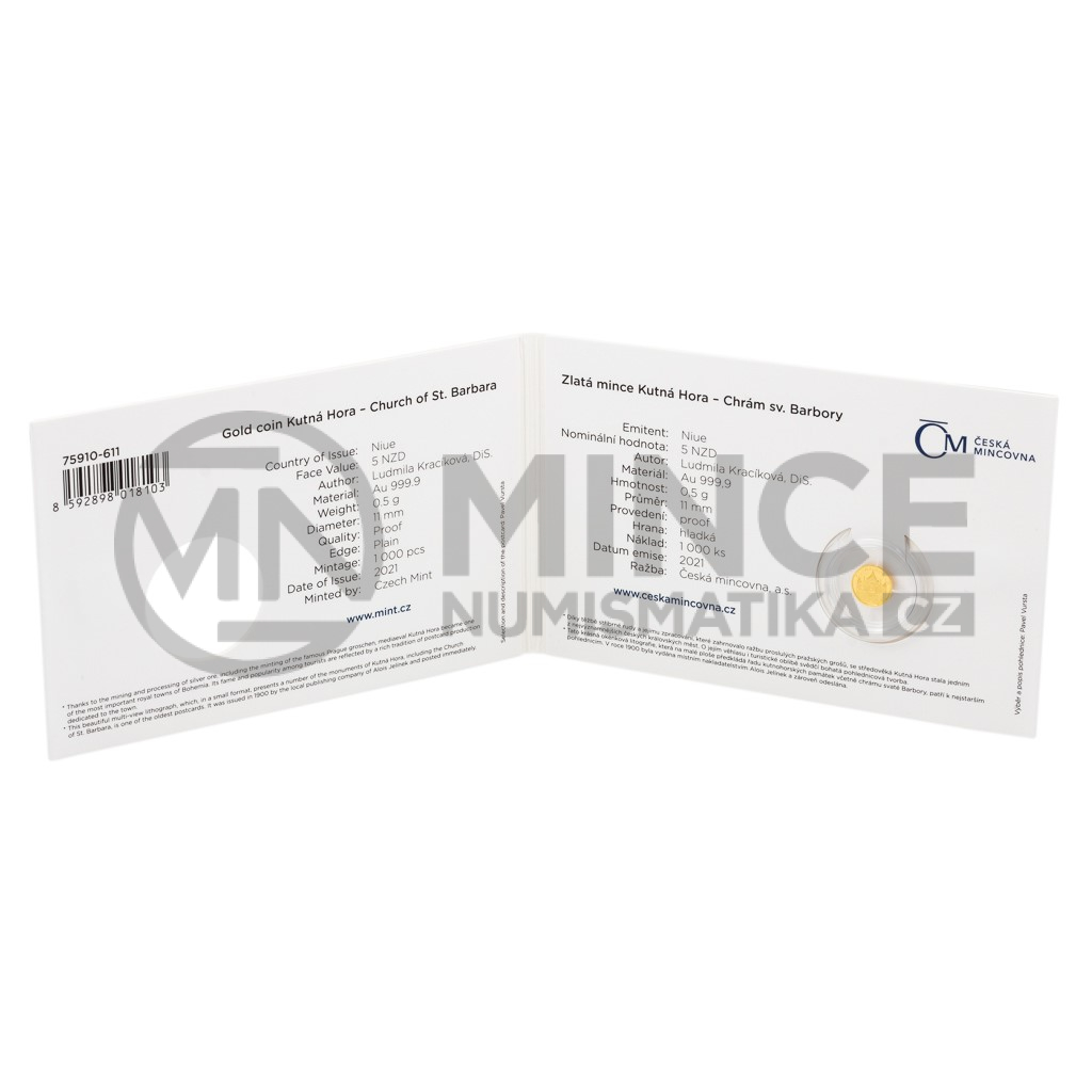 Medailérka Ludmila Kracíková, DiS., věnovala reverzní stranu mince chrámu svaté Barbory – konkrétně jeho neogotickému průčelí, které stejně jako pohlednice pochází z konce 19. století. Stavbu doprovází opis KUTNÁ HORA. Averzní strana pak náleží portrétu a jménu královny Alžběty II., letopočtu vydání 2021 a nominální hodnotě 5 DOLLARS (NZD) – čili atributům ostrova Niue, který České mincovně poskytuje zahraniční licenci k ražbě vlastních pamětních mincí.