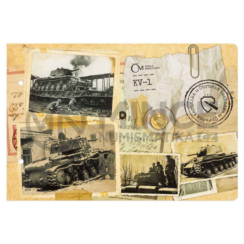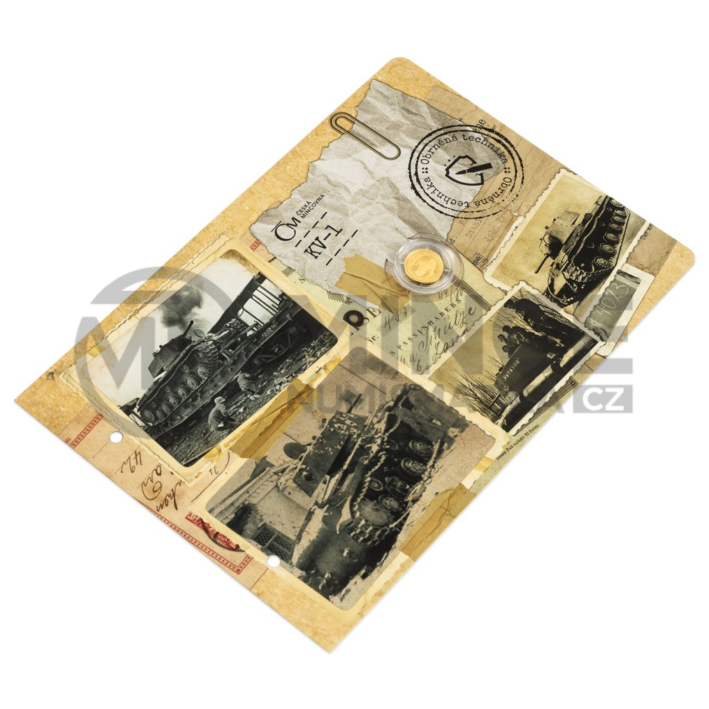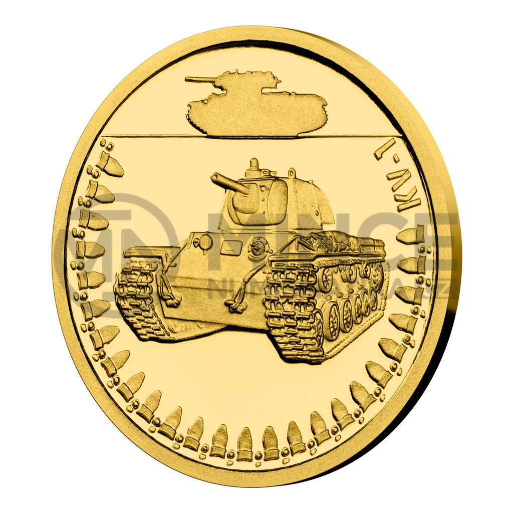Na šesté zlaté minci České mincovny z cyklu Obrněná technika se objevuje sovětský tank KV-1, který sloužil za druhé světové války.