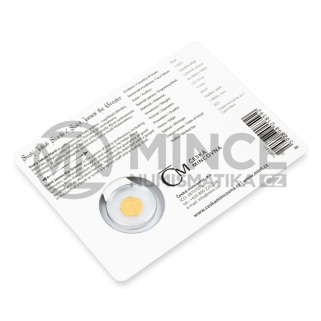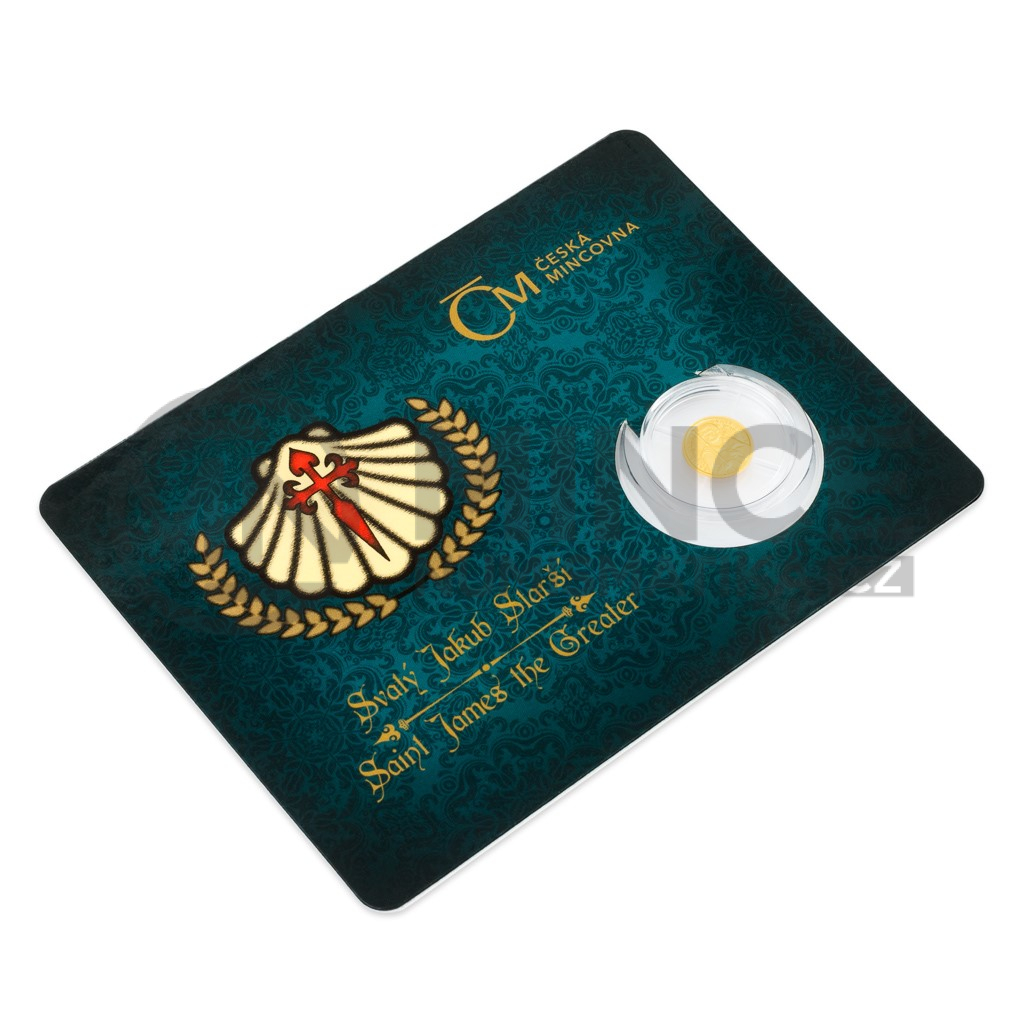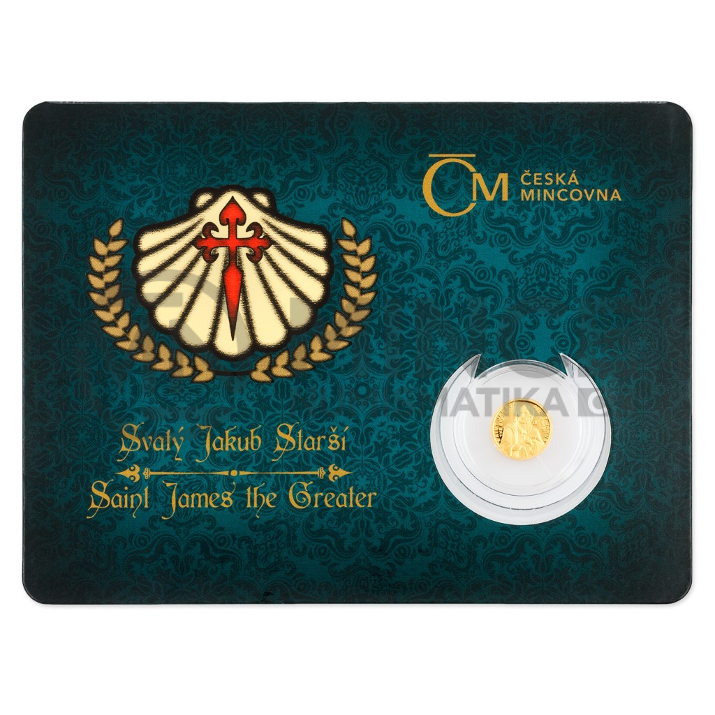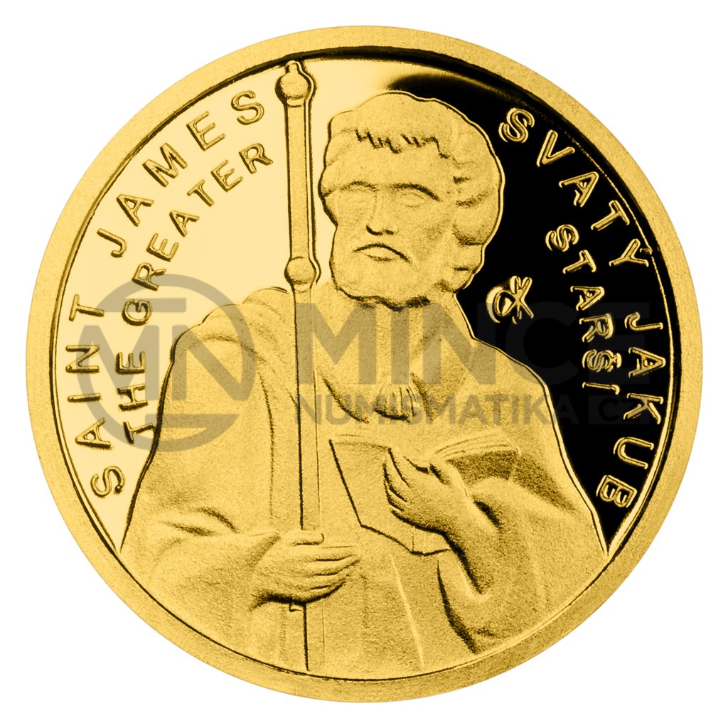 Sedmá zlatá minimince České mincovny z cyklu Patroni je věnována apoštolovi svatému Jakubovi Staršímu.
