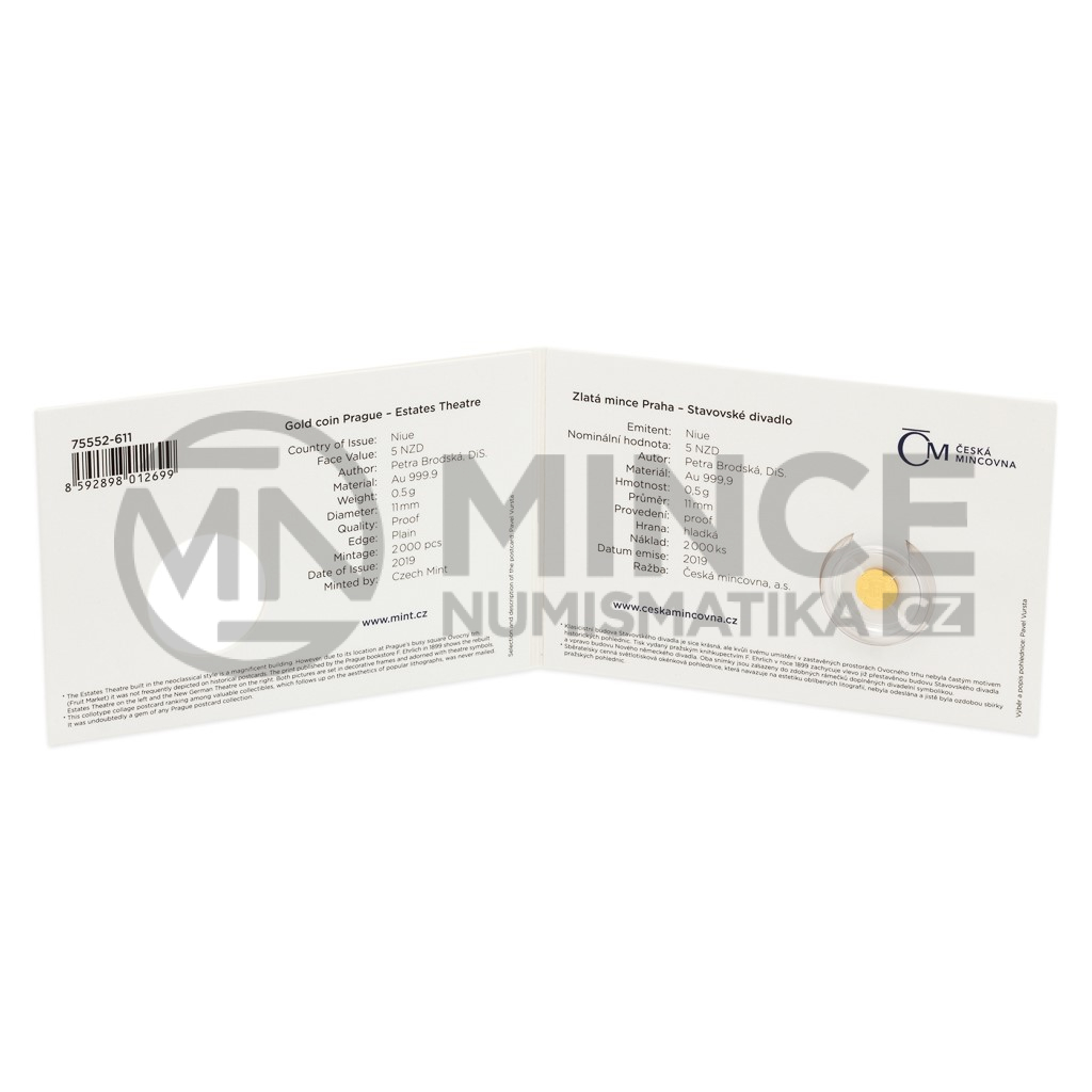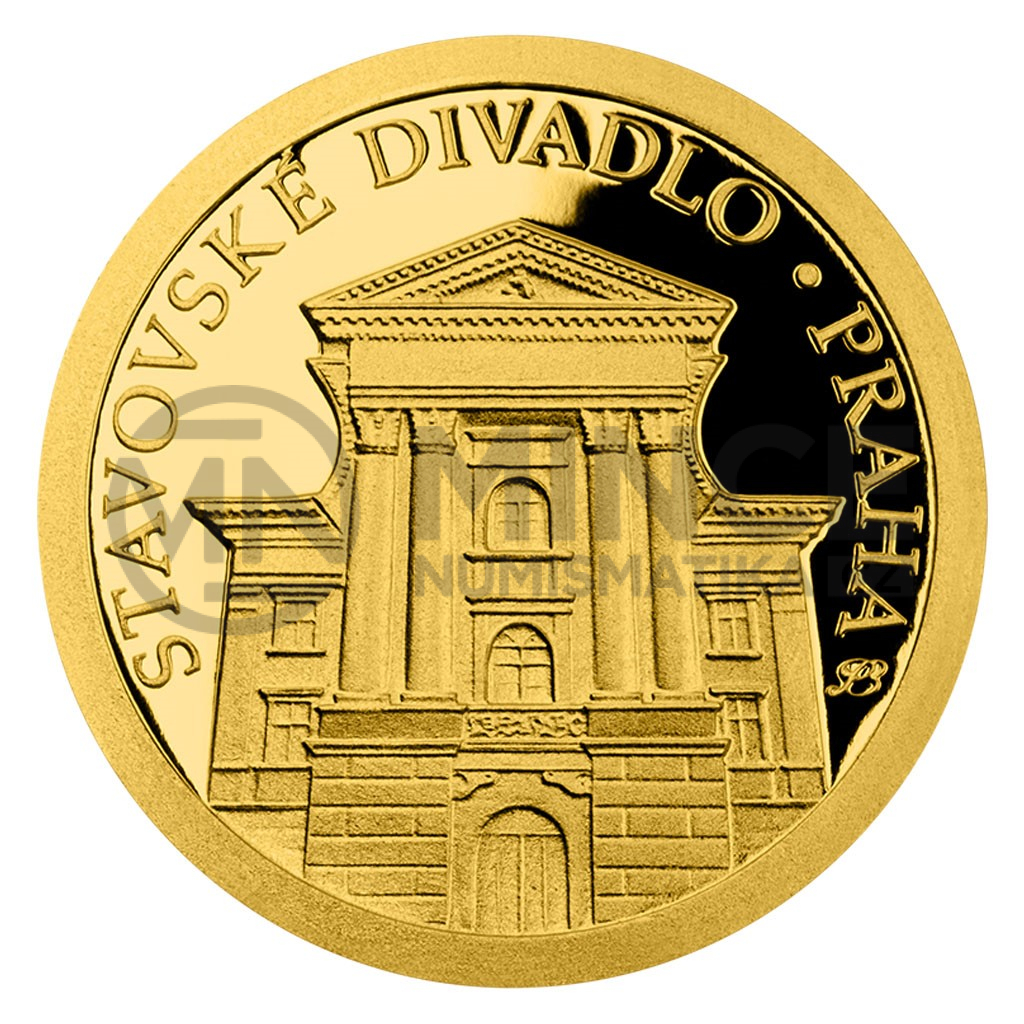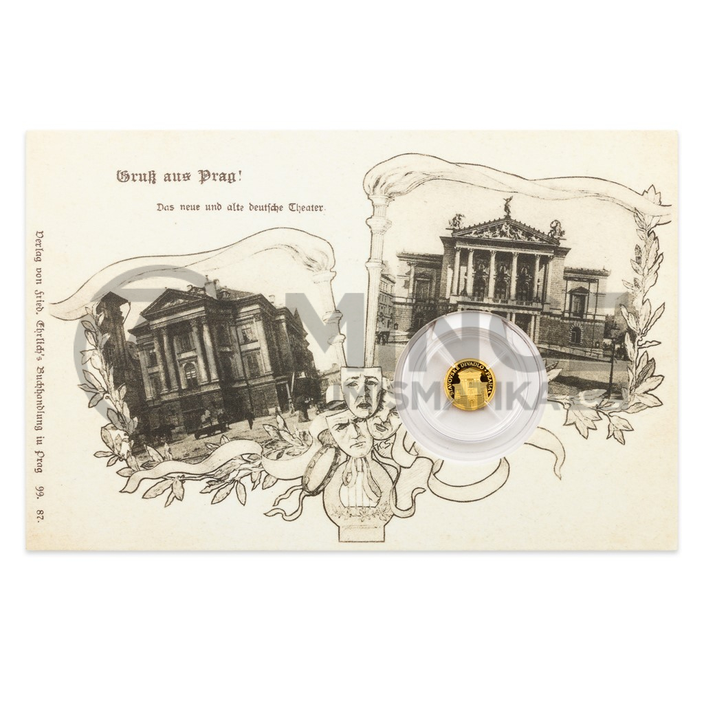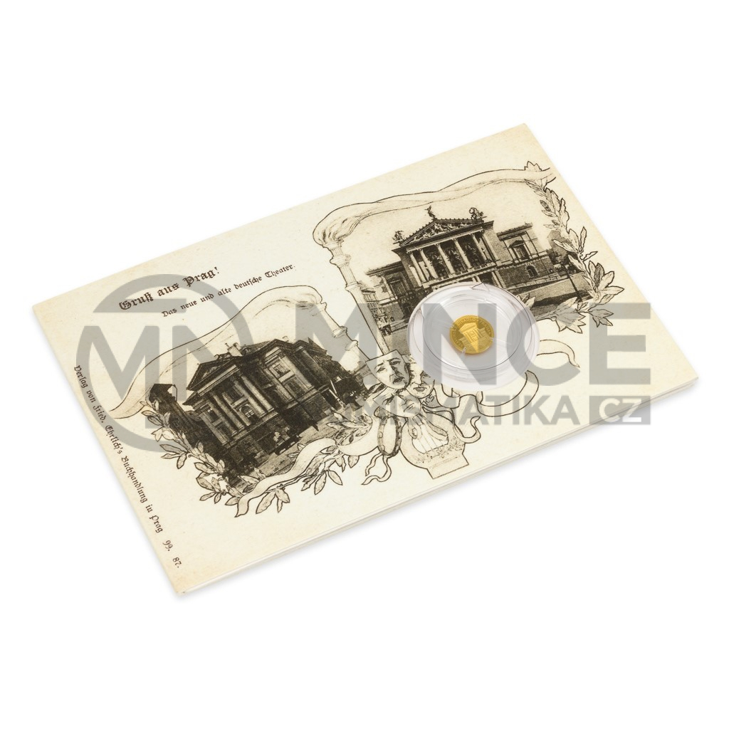 Další zlatá mince České mincovny o hmotnosti jedné poloviny gramu, která je uložena do repliky historické pohlednice, připomíná pražské Stavovské divadlo.