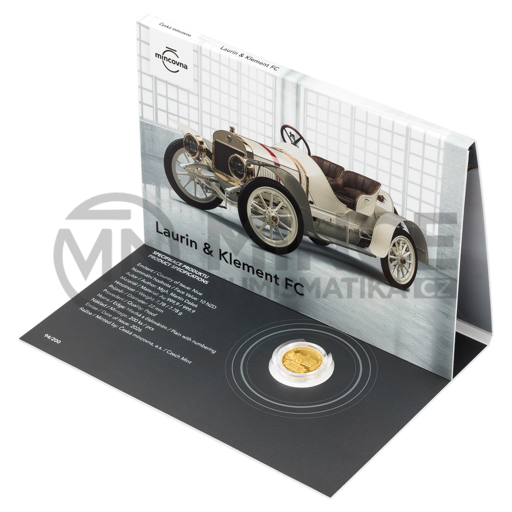 Reverzní strana mince, která je dílem medailéra MgA. Martina Daška, předkládá celkový pohled na automobil obklopený opisem LAURIN & KLEMENT FC 1908–1909. Kompozici dotváří detail ozdobného výrobního štítku. Protože mince České mincovny vycházejí v licenci zahraničního emitenta, kterým je ostrov Niue, jejich averzní strana nese jeho nezbytné atributy – portrét krále Karla III., nominální hodnotu 10 DOLLARS (NZD) a rok emise 2026.