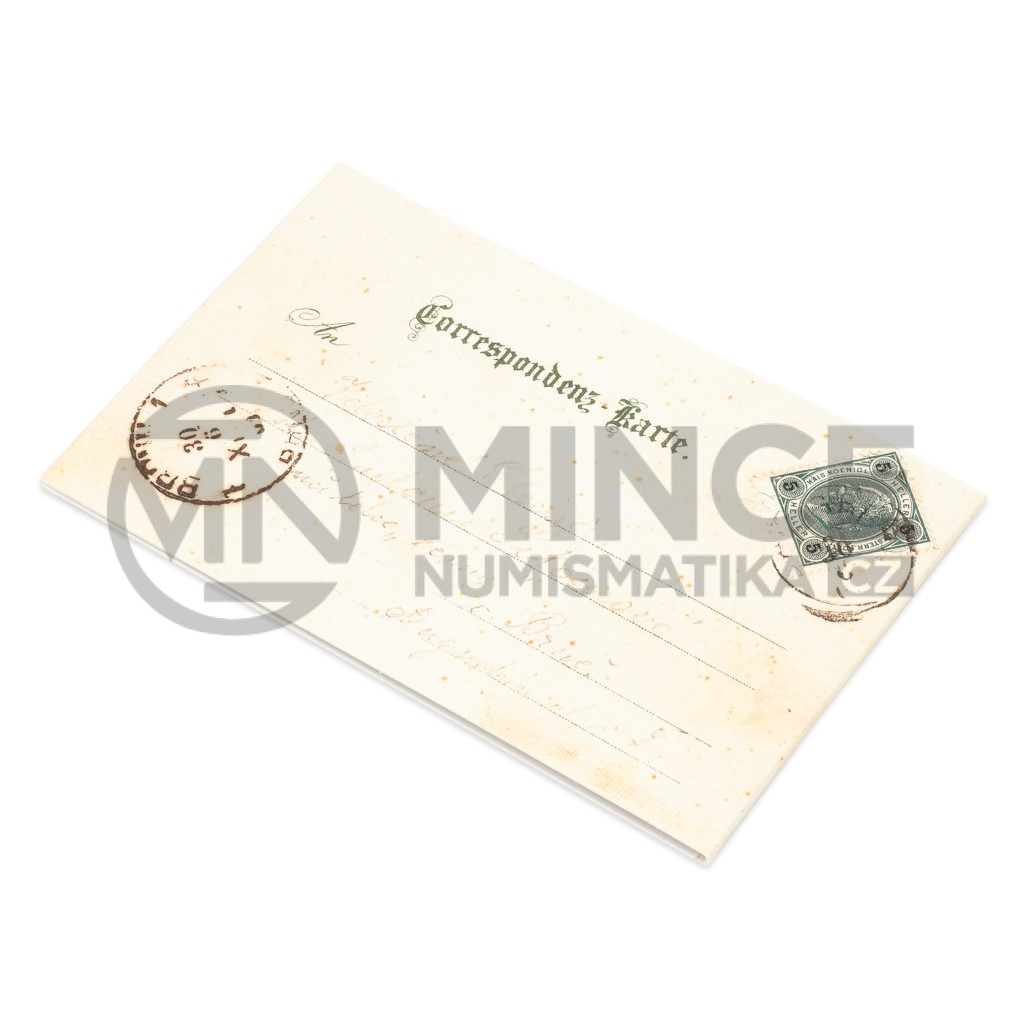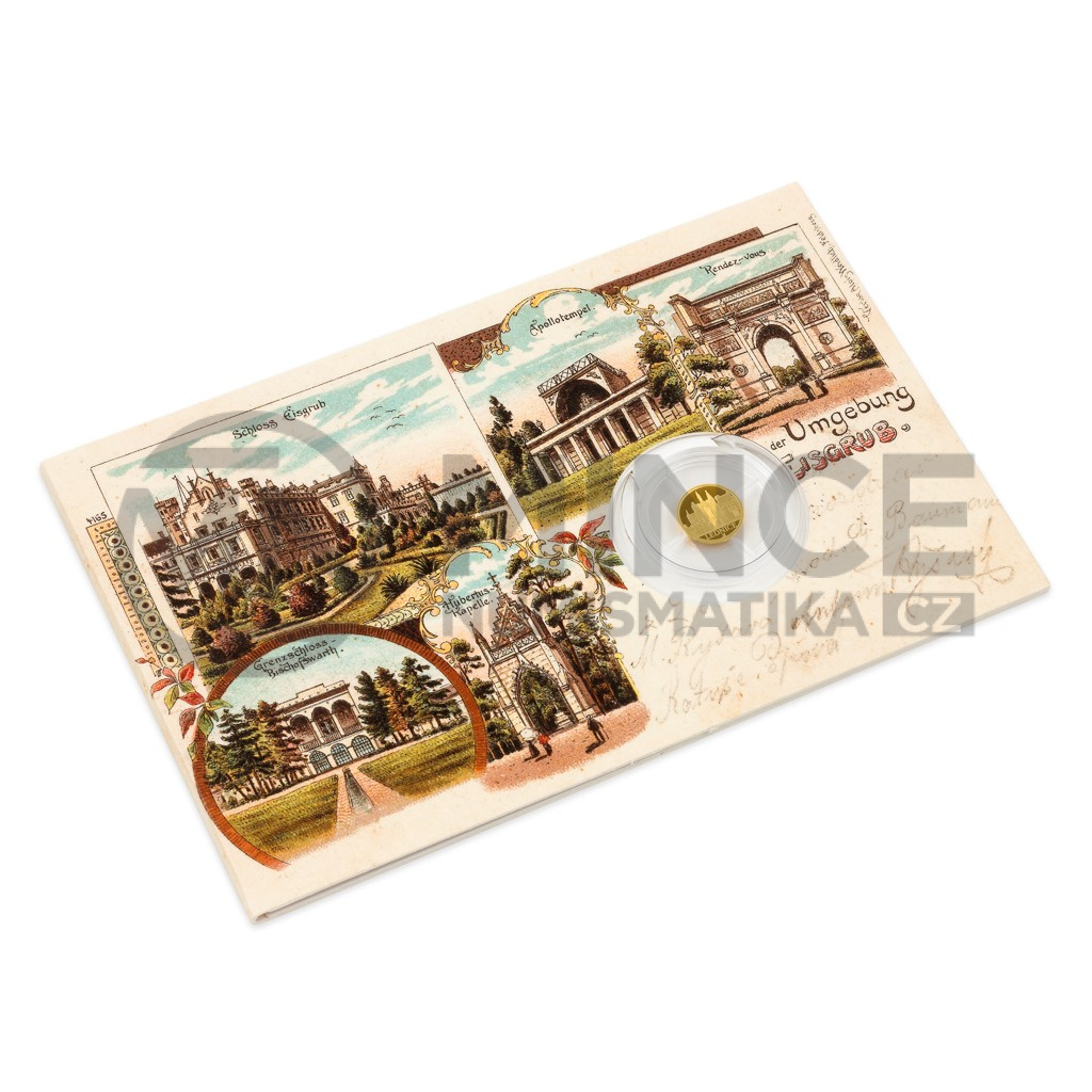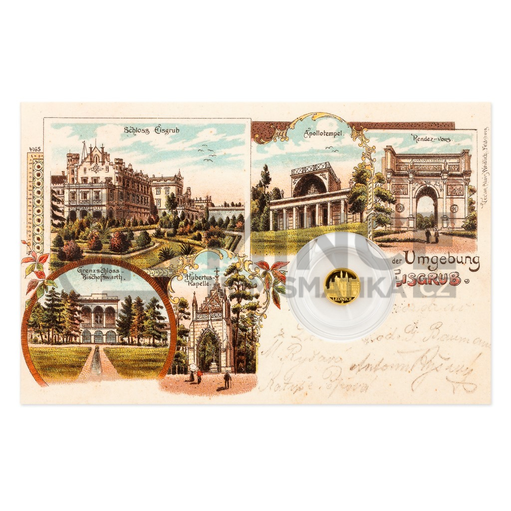 Pohlednicová tvorba věnovaná historické jihomoravské oblasti je velmi bohatá a představuje chloubu každé sbírky. Zdobnou okénkovou litografickou pohlednici, která posloužila jako předloha balení mince, vydalo nakladatelství Aloise Weidlicha (dříve Franz Hübl) v roce 1900. Tisk zachycuje významné stavby a památky lednicko-valtického areálu, ve kterém se snoubí přírodní krásy a nevšední kulturní památky. Majestátní zámek Lednice (Schloss Eisgrub) je obklopen rozlehlými parky, zahradami, rybníky a množstvím saletů, tedy menších staveb roztroušených po okolí. V těchto architektonických perlách se mísí nespočet tradičních i pro střední Evropu exotických stylů – návštěvníci se mohou kochat například řeckým Apollonovým chrámem (Apollotempel), římským vítězným obloukem Dianina chrámu (Rendez--vous), klasicistním Hraničním zámečkem (Grenzschloss – Bischofswarth) či novogotickou kaplí svatého Huberta (Hubertus-Kapelle).
