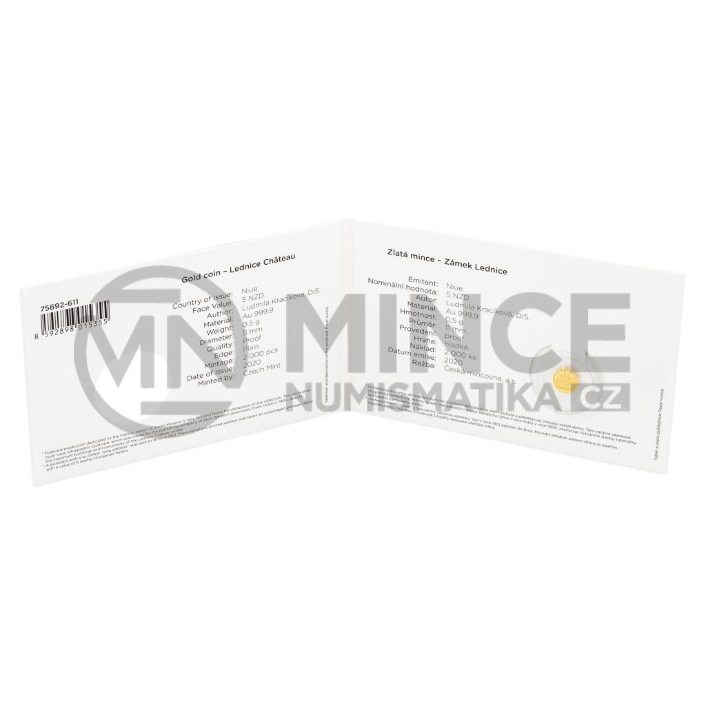 Další emise z volného cyklu zlatých minimincí zasazených do replik historických pohlednic je věnována zámku Lednice a jeho okolí, které je zapsáno na seznamu světového dědictví UNESCO.