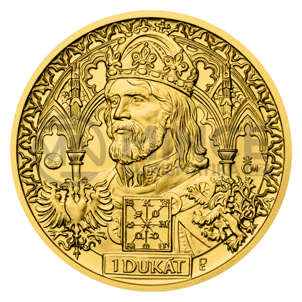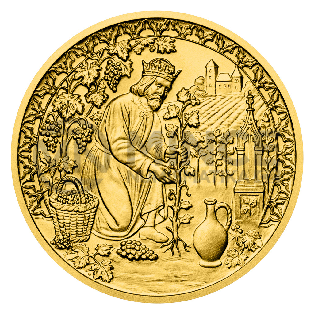 Medailérka MgA. Petra Čánská věnovala averzní stranu dukátu idealizovanému vyobrazení Karla IV., který na vinici vlastnoručně pečuje o vinnou révu. Panovník se Svatováclavskou korunou na hlavě vévodí i reverzní straně, kde ho doprovází císařský monogram, dvouocasý český lev, dvouhlavý říšský orel a nápis 1 DUKÁT. Na obou stranách pak najdete ještě bohatý gotický dekor.